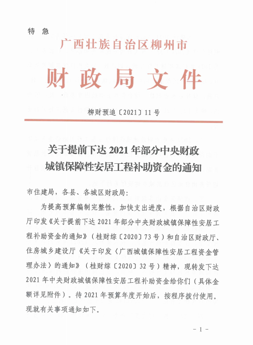 | 通知公告关于提前下达2021年部分中央财政城镇保障性安居工程补助资金的通知 |