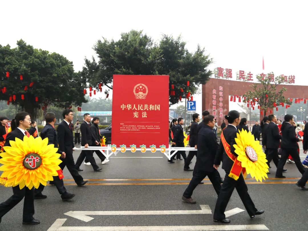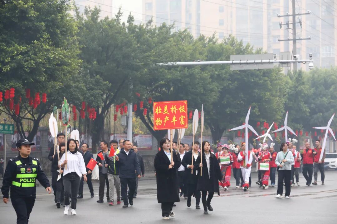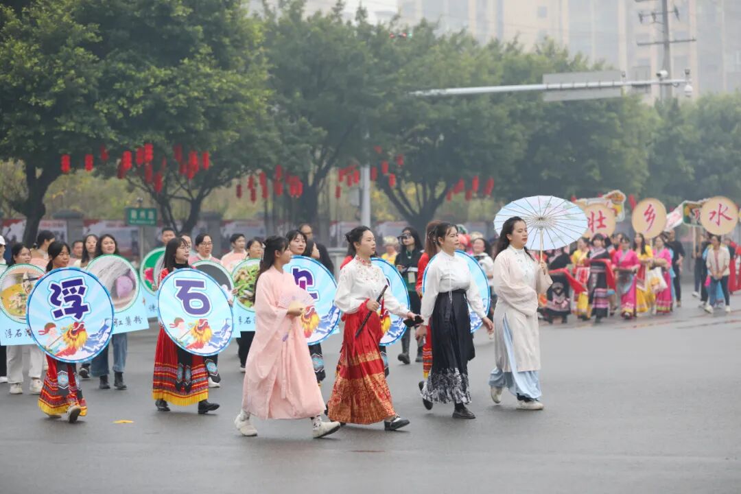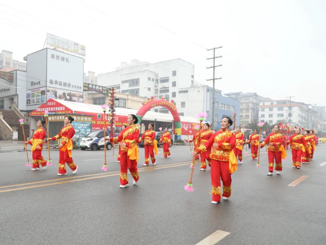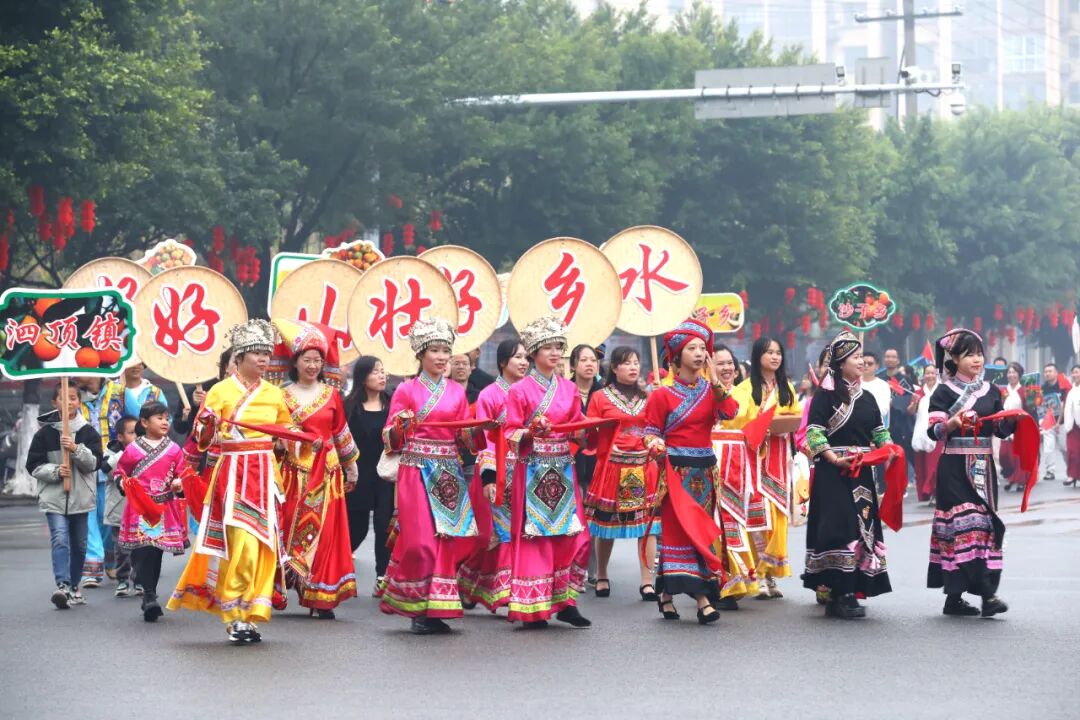 12月10日上午,在本届金桔文化旅游节开幕式前,融安县调动全县有关企业、社会组织和12个乡镇,结合非遗文化、金桔文化、当地特色农产品等元素组建游行队伍进行展示巡游;除了醒狮、舞龙、腰鼓、钱排、秧歌灯牌、龙凤船等传统游行队伍,还有各乡镇特色队伍,打造“欢喜桔行”民俗文化千人游行方阵,形成一道具有地方特色的靓丽风景,所到之处,群众纷纷驻足观看拍照,为金桔文化节营造喜庆、欢乐的节日氛围。