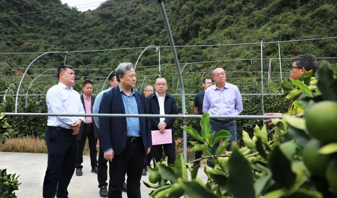 调研期间,潘灿平院士一行首先前往融安县仁秀金桔种植家庭农场,走进田间地头,实地考察金桔种植实验基地,详细了解融安金桔种植技术、生长管理以及产业发展现状等情况,针对融安金桔种植过程中存在的技术难点与优化方向,与农场负责人及技术人员展开深入交流,并提出指导建议。