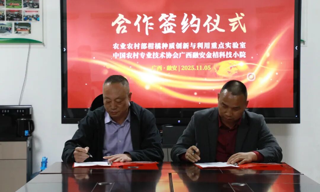 随后,调研组一行来到融安县农村专业技术协会进行指导。协会相关负责人向调研组详细介绍协会的组织架构、服务范围、技术推广成效及近年来在助力当地农业产业发展方面的工作情况。双方围绕产业升级、技术创新、成果转化等核心议题充分沟通、交流,并正式签订合作框架协议,为后续深度合作奠定坚实基础。活动现场还举行了农业农村部柑橘种质创新与利用重点实验室试验示范工作站授牌仪式,标志着融安县在特色农业技术研发与应用领域迈出重要一步,将进一步推动科研资源与地方产业需求精准对接。