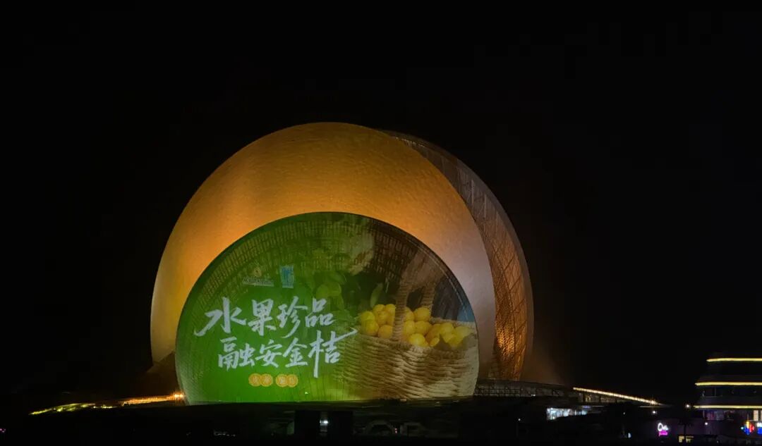 11月8日晚,“水果珍品 融安金桔”大型公益广告亮相珠海地标建筑日月贝。(方淑敏 摄)