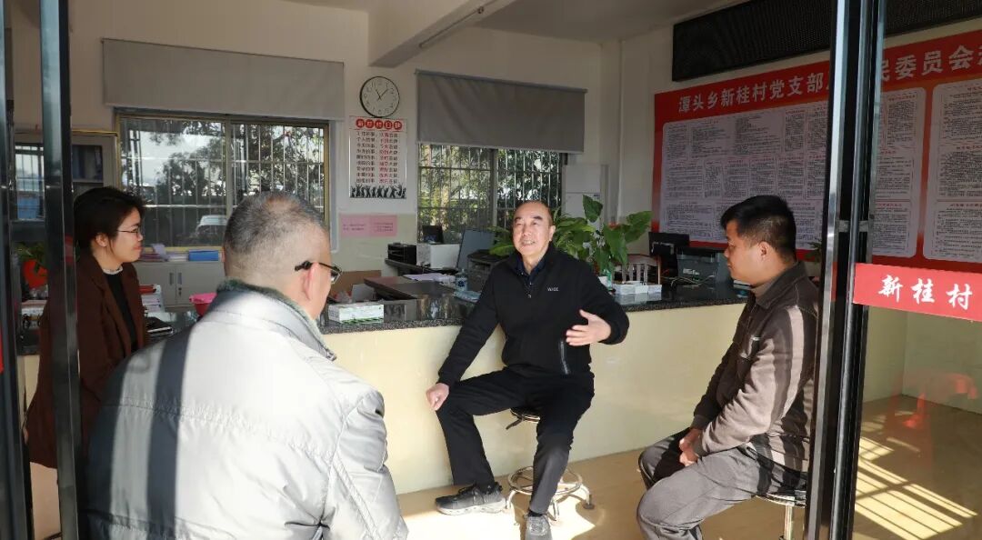 1月13日,在潭头乡新桂村党群服务中心,陈宏(右二)与基层干部面对面交谈。(覃嘉鑫 摄)