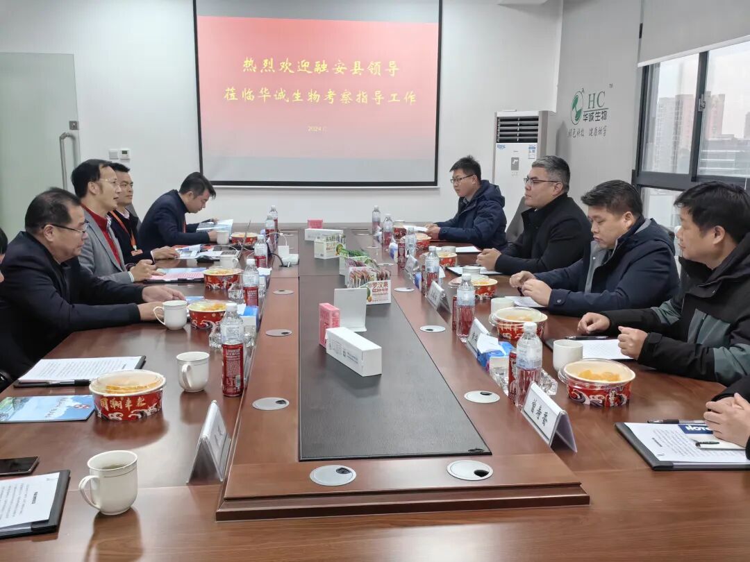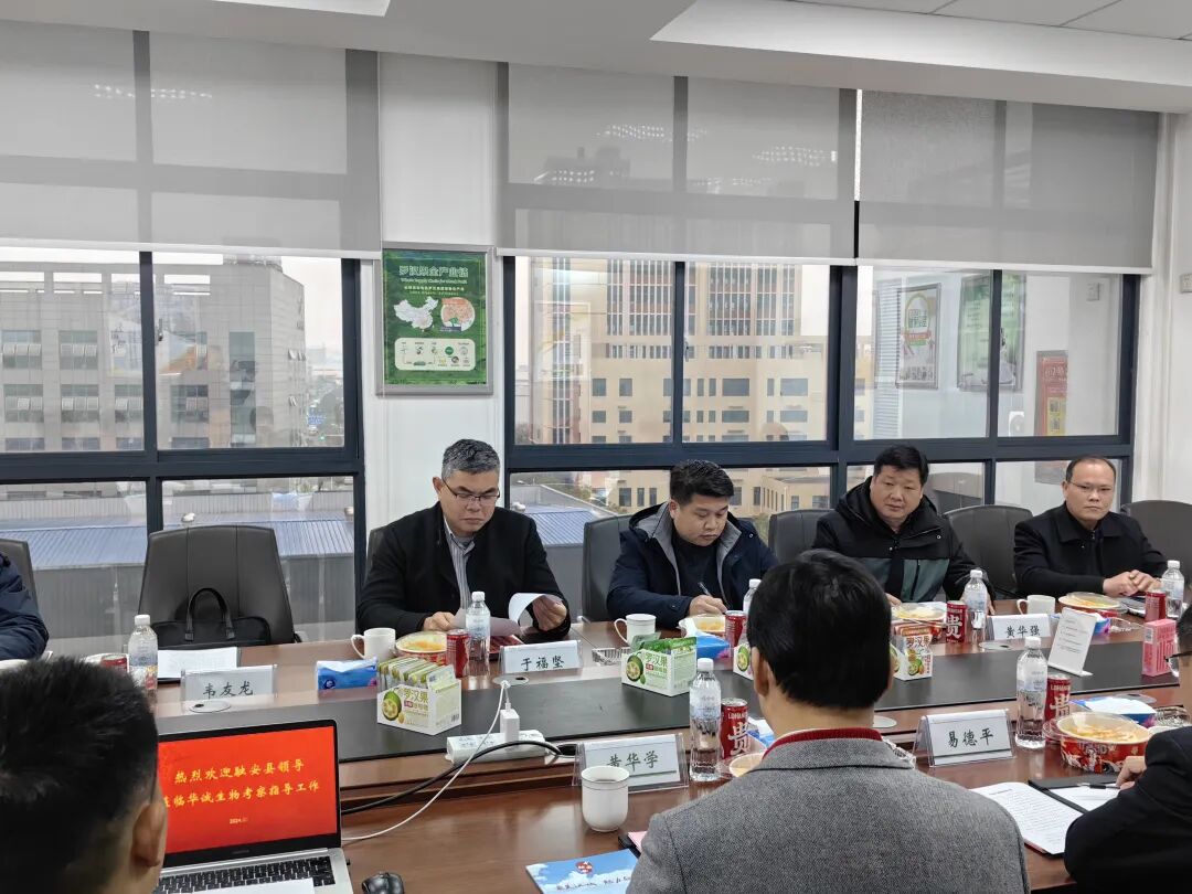 2月27日,融安县委书记、县长于福坚(右二)带队到湖南华诚生物资源股份有限公司开展座谈会。(韦友龙 摄)