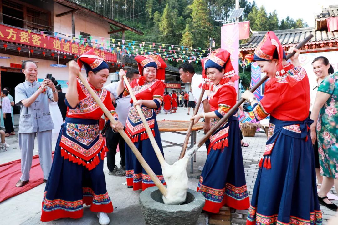 10月1日,在古龙村平寨屯拍摄的板榄镇古龙村首届姑娘回门节活动现场,回门姑娘们在打糍粑。(骆余梦 摄)据了解,此次古龙姑娘回门节为该村在原古龙村平寨屯姑娘回门节基础上进一步扩大规模举办,160余名回乡的外嫁女中,包含“50后”至“00后”各个年龄段的女同胞,曾经她们出嫁他乡,逢年过节能够回来与家人团聚的少之又少,为与双亲团聚、为报父母养育之恩、为尽孝悌之情,古龙村在村民们的大力支持下,举办了古龙姑娘回门节,弘扬“家”文化、孝悌文化,助推乡风文明。