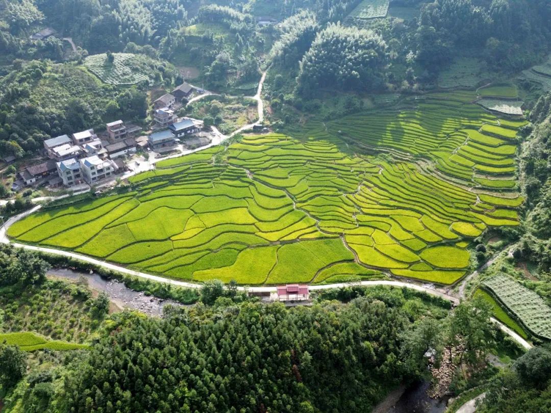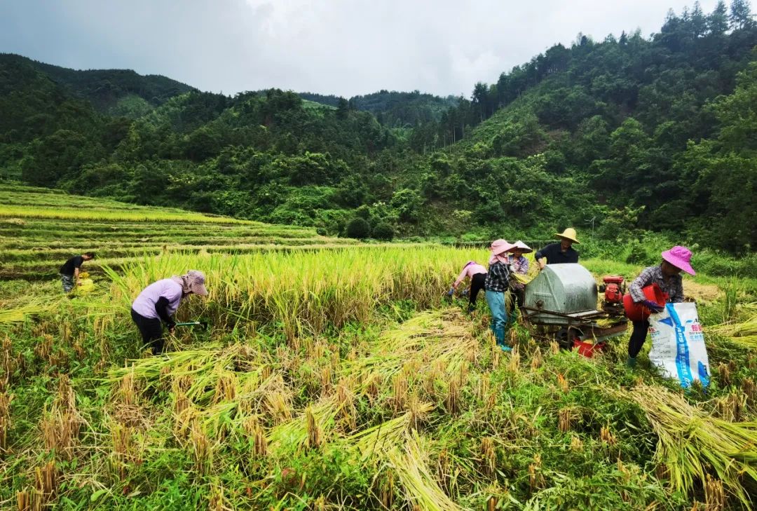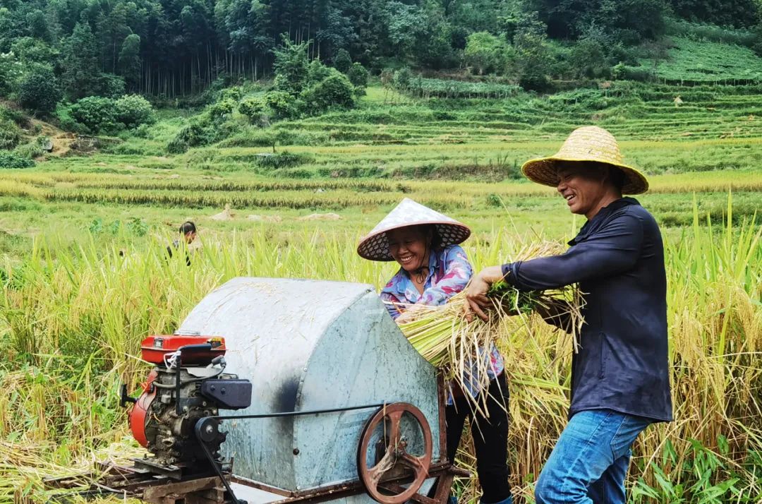9月8日,在板榄镇东岭村田洞屯拍摄的稻田。(武巍 摄)9月21日,在板榄镇东岭村田洞屯,金黄的稻穗和蓝天、青山、绿水绘就成了一副美丽的丰收画卷,村民黎世忠一家人正在屯边的梯田中收稻谷,收割、脱粒、装袋,丰收现场忙碌而有序,脱粒机的轰鸣声掩盖不住村民爽朗的笑声。“今年我这块稻田亩产最少有800多斤,目前一斤能卖到一块七毛多钱。”聊到产量和收入,黎世忠满脸的喜悦溢于言表,并热情地邀请笔者到家里吃午餐。