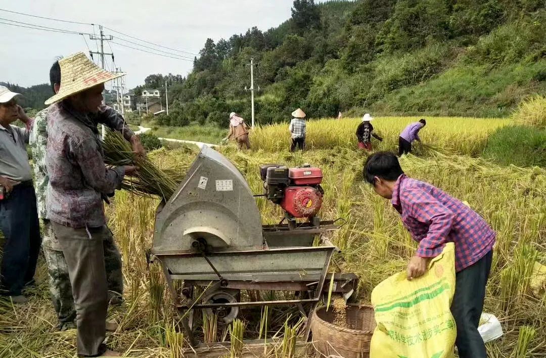 9月22日,板榄镇东岭村田洞屯村民正在稻田中收购稻谷并现场脱粒。(武巍 摄)