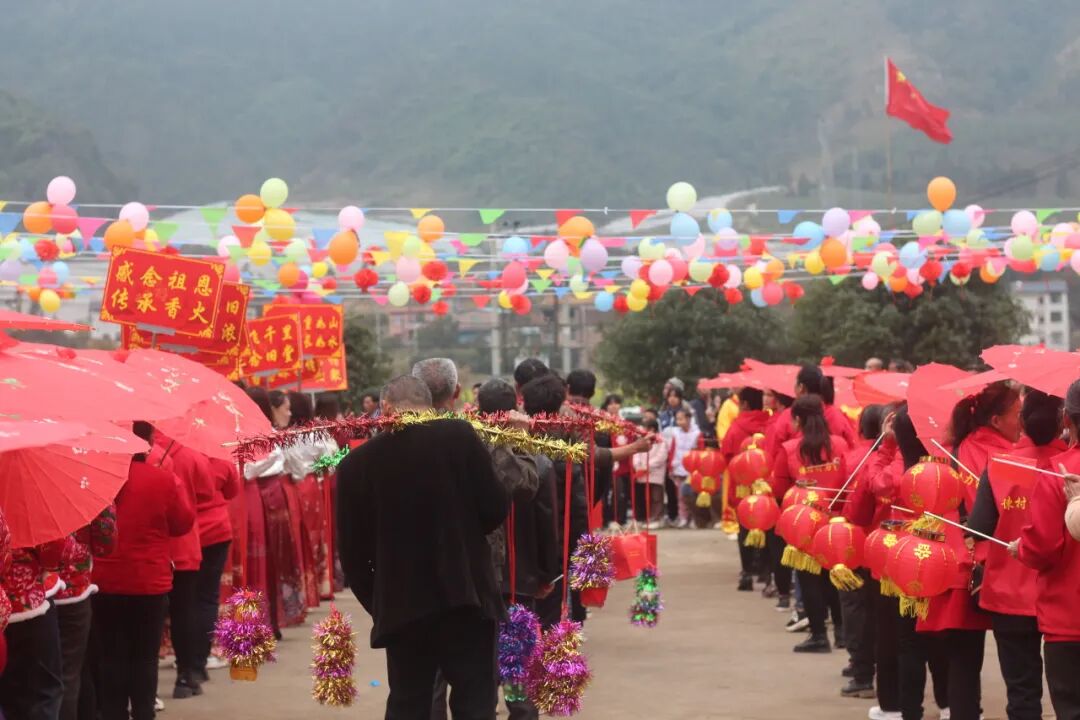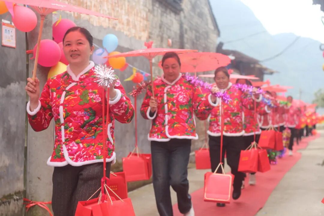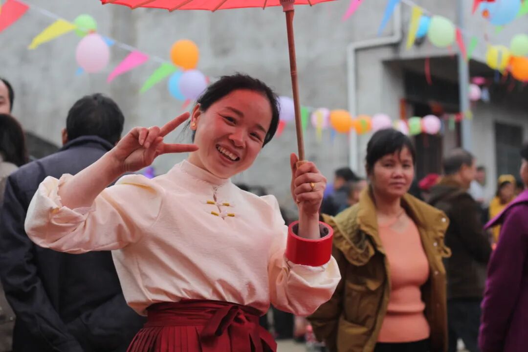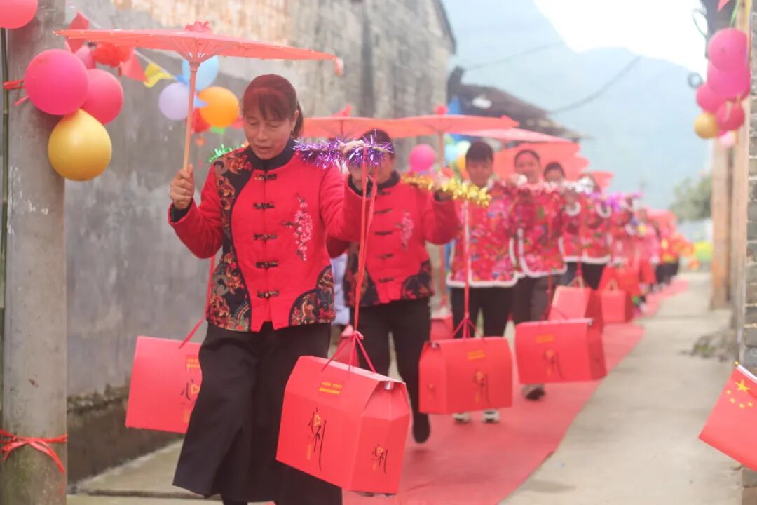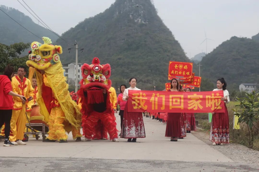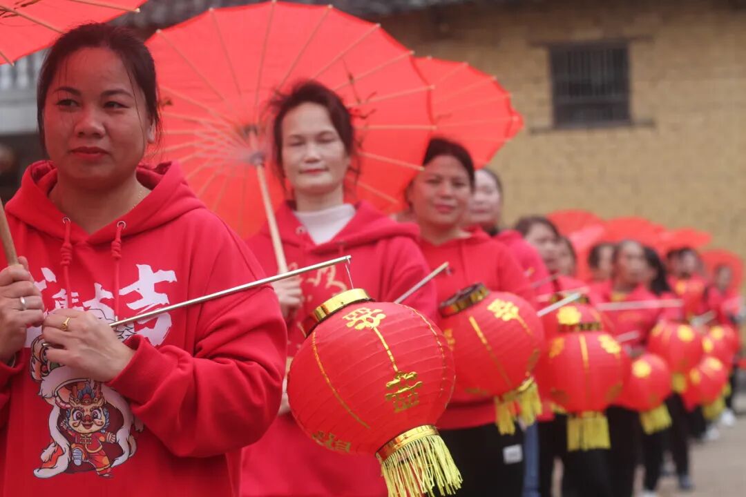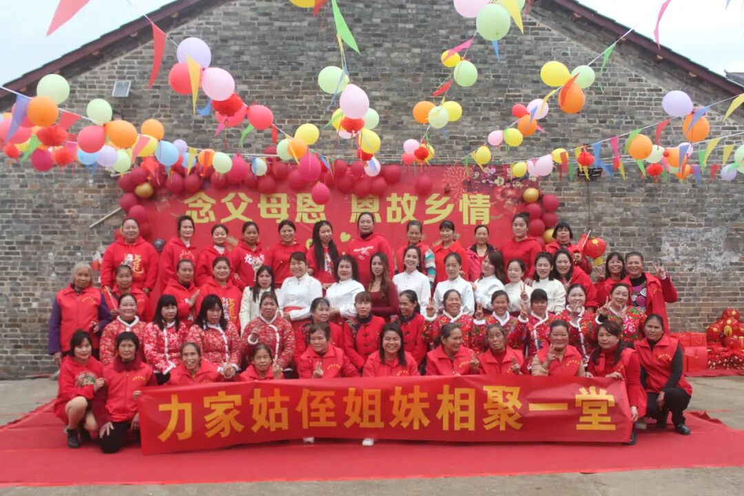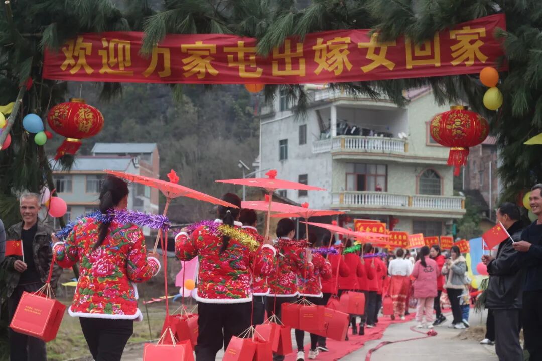 当天,力家屯彩旗飘飘、锣鼓喧天。外嫁女穿着盛装,或高举标语牌、或撑着油纸伞、或肩挑礼品,排成一列。在舞狮队的带领下,伴随着鞭炮和锣鼓声中,她们踩着欢快的步子,沿着两旁挂满了彩色气球、地铺红地毯的村道向屯中心走去。她们与村里的父老乡亲团圆,念亲恩、传孝道。