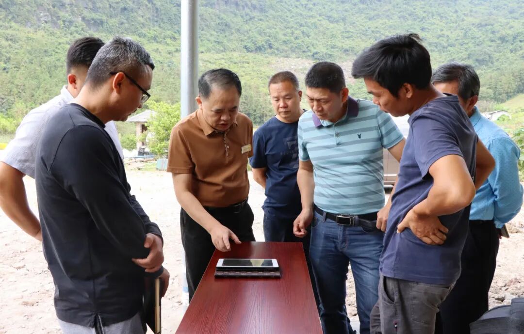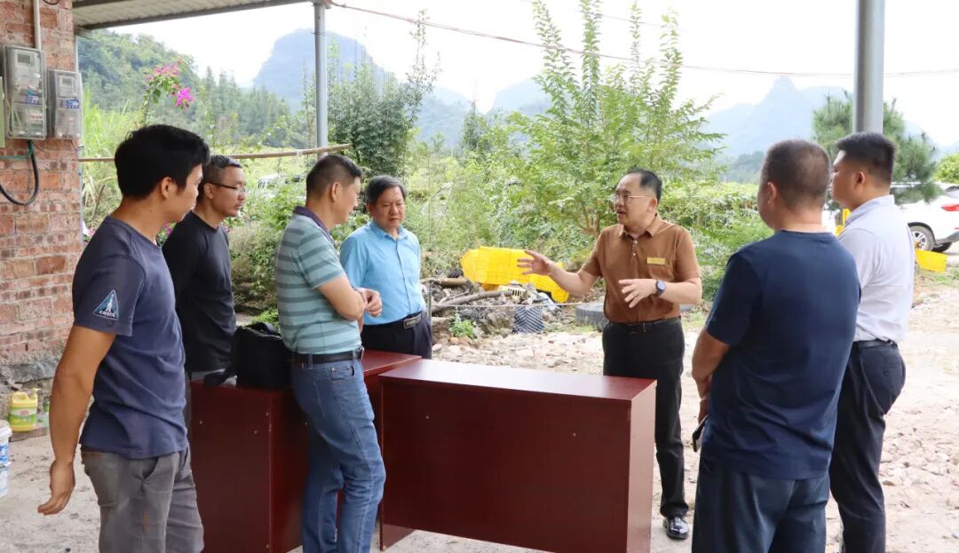 10月26日,在融安县桥板乡古丹村田弄养殖场,乡主要领导与企业的领导人正在交流。(兰佳盛 摄)