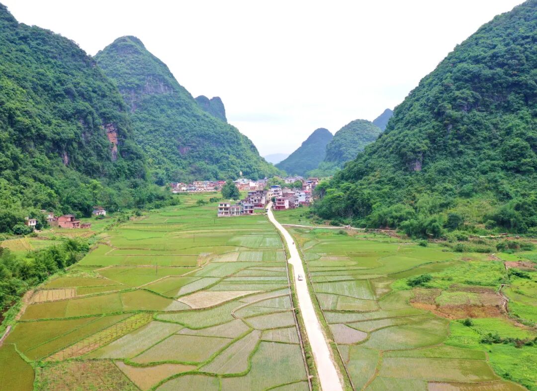 5月18日,航拍的融安县桥板乡美丽乡村古板村,村庄与田间、青山、小道相映生辉,呈现出一幅人与自然和谐共生的美丽画卷。