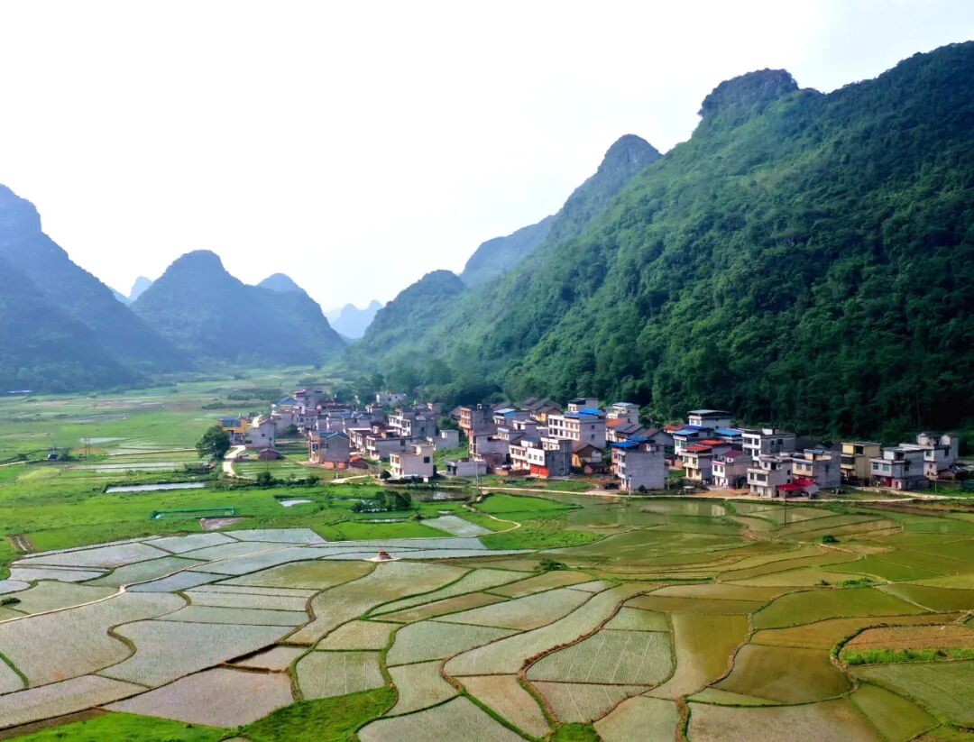 5月18日,在融安县桥板乡古板村良午屯、古板屯拍摄的田间风光。