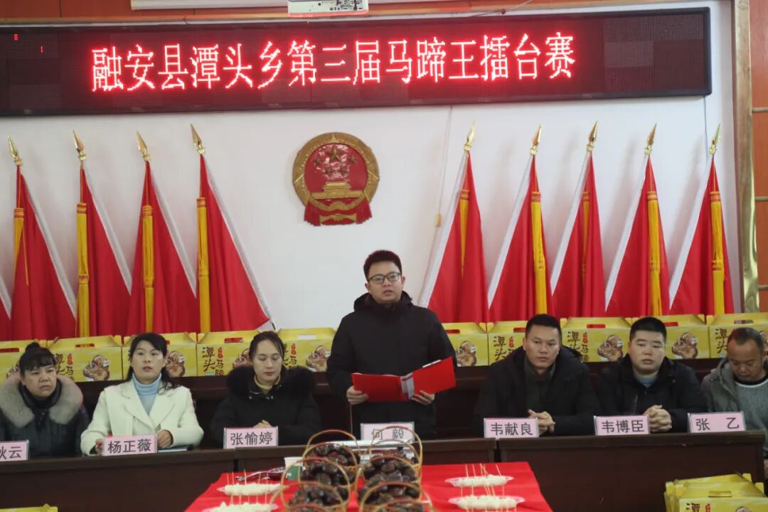1月30日,潭头乡第三届马蹄王擂台赛现场,乡党委书记何毅致辞。