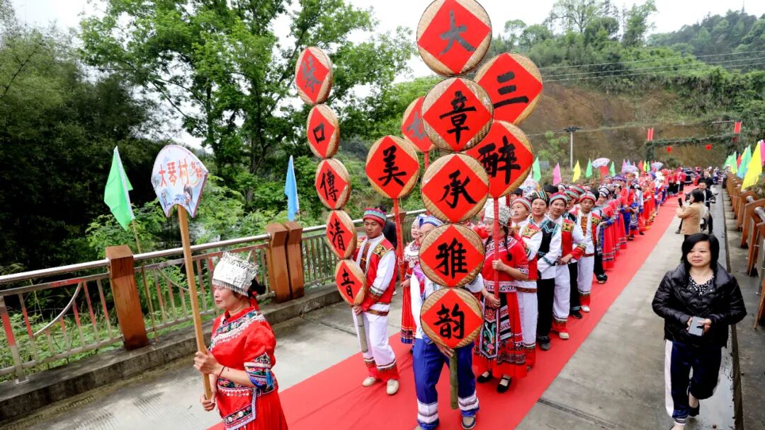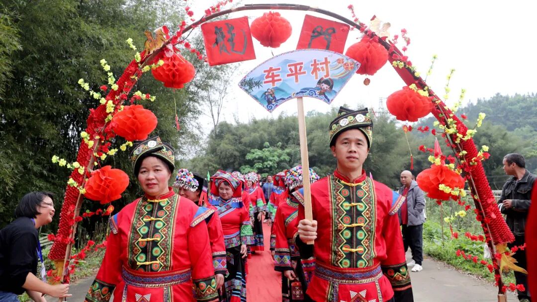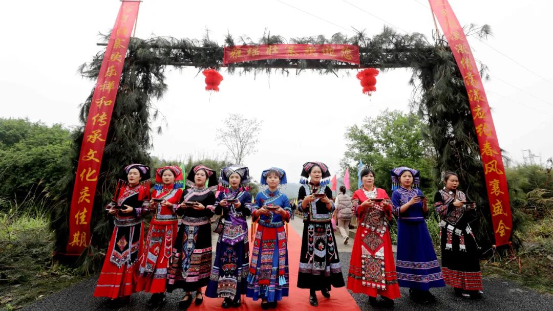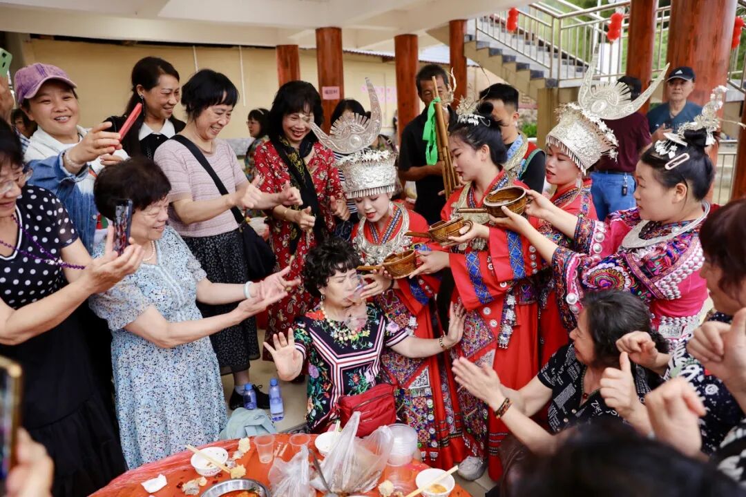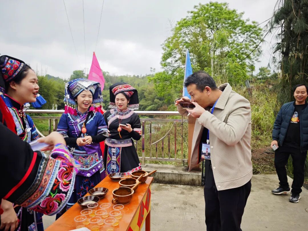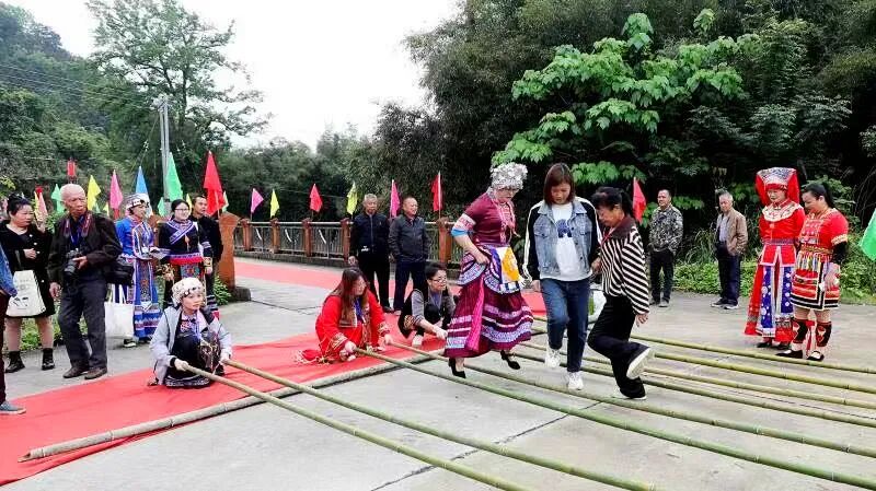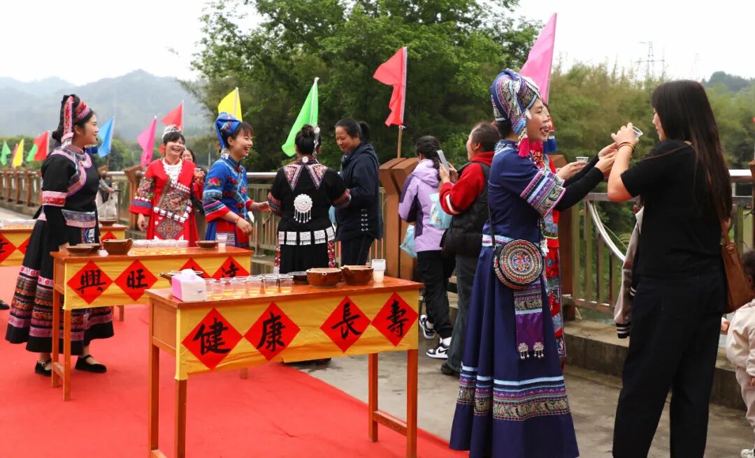 “贝呀侬哎,客人来到家门口咧,敬上三杯迎客酒,米酒香醇山歌唱,壮家情意捧呀捧在手...”今有贵客远道而来,一杯拦门酒,一道真心话。活动开始,美丽的各族姑娘们身穿节日服装,载歌载舞在寨门两侧相迎,寓意“健康长寿、升官发财、幸福美满”的三道拦门酒再加上竹竿舞清脆的敲打声,让宾客感受雅瑶的热情美好。