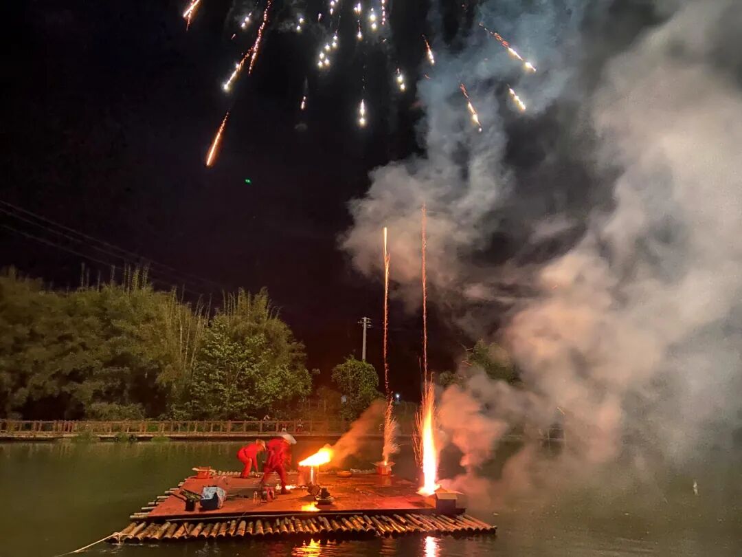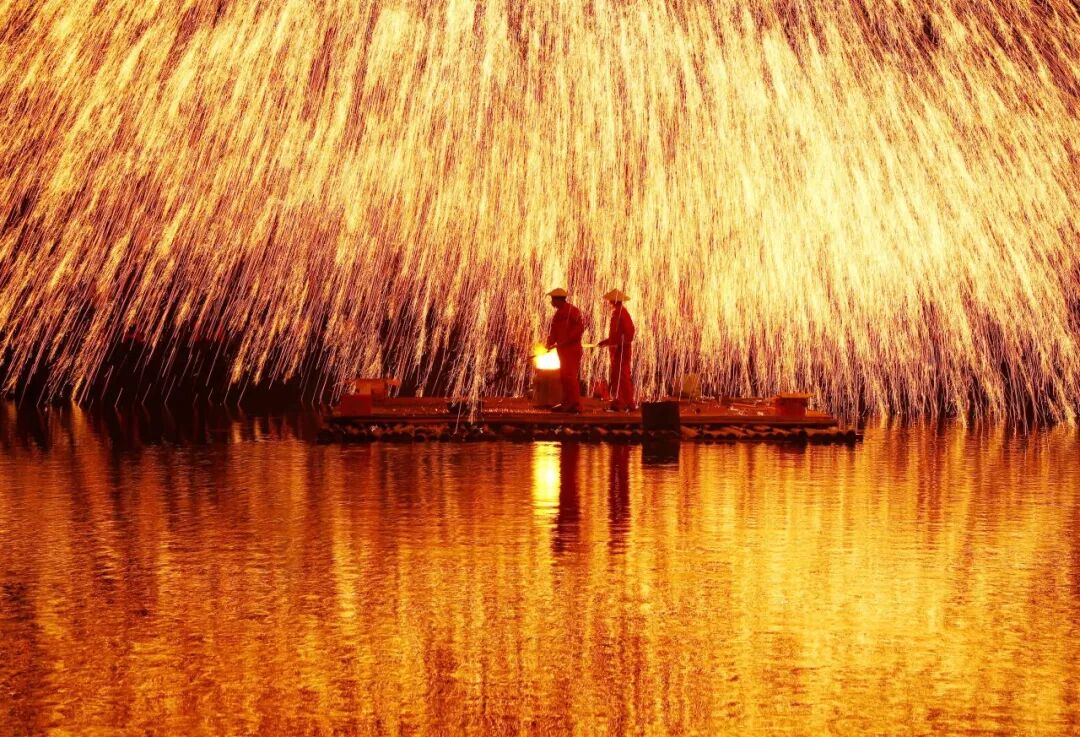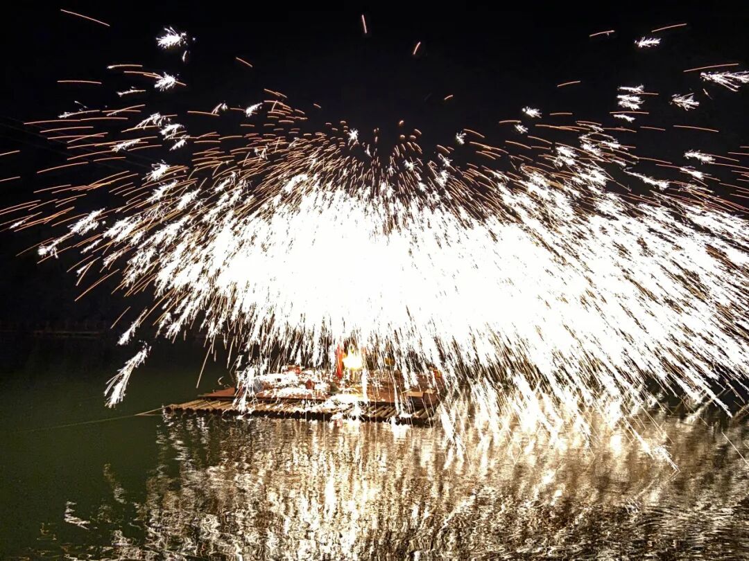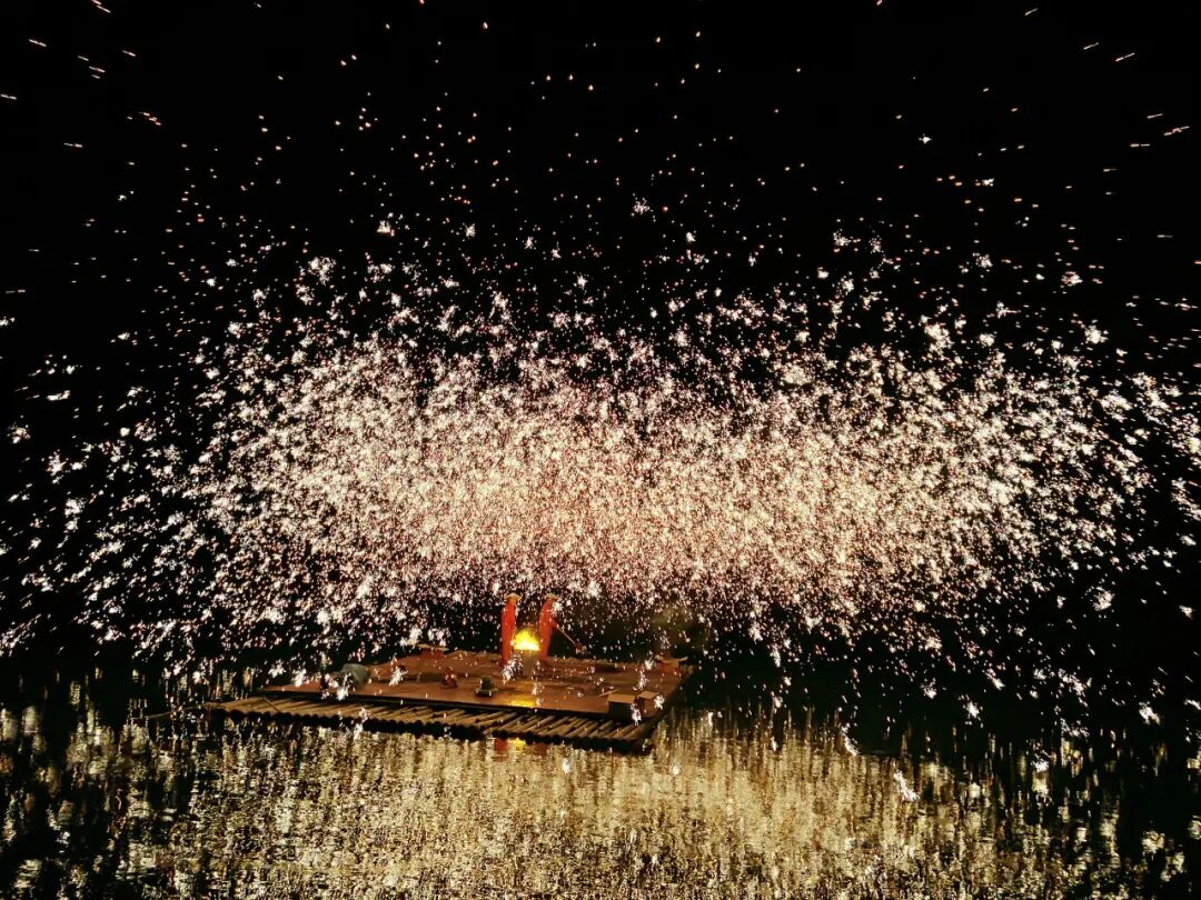 以星空为幕,以江水为景;一簇簇烟花在水上舞台燃放,似跳动的精灵,水天一色,壮美绚丽,将黑夜点亮,将欢乐传递。随后,传统文化遗产项目“打铁花”在水上舞台精彩上演,铁水在夜空中散落,一片灿烂的星花在夜色中绽放开来,为宾客献上最震撼的铁与火的盛宴。