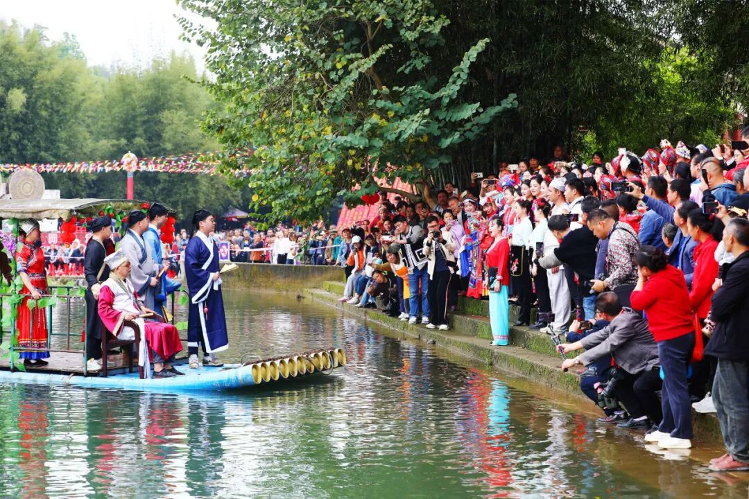 山水为景,天空为幕;竹林轻咛,看三姐们精彩亮相!在群众的欢呼声中,10名最美“刘三姐”乘着花船,自吊桥顺水而下,沿着河流抛绣球,与岸上宾客精彩互动。船至水上舞台,分别为10名最美“刘三姐”颁奖、送上丰厚奖品。