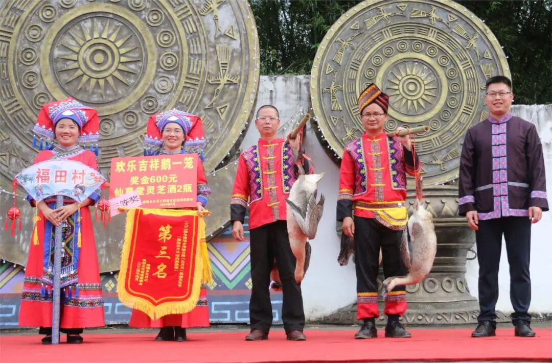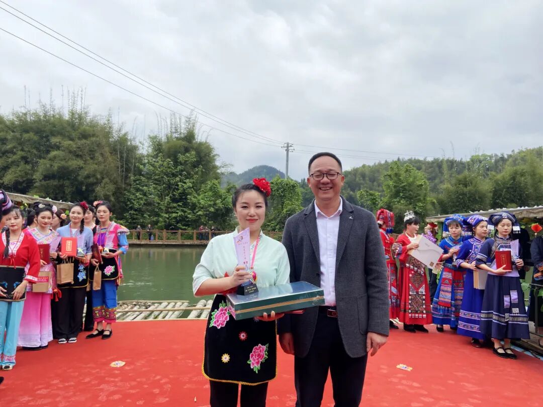 县文化体育广电和旅游局局长李瑞华(前右一)为最美“刘三姐”季军荣珍珍颁奖。