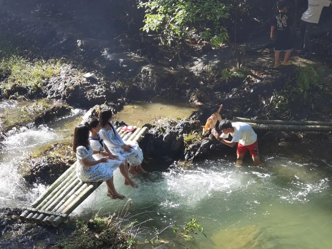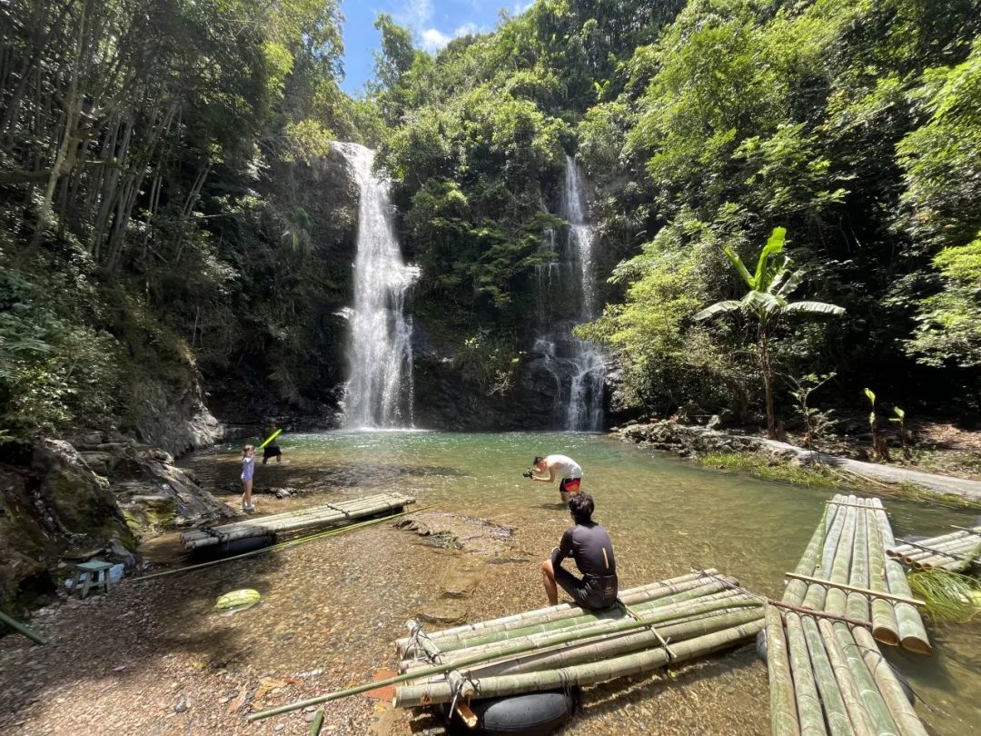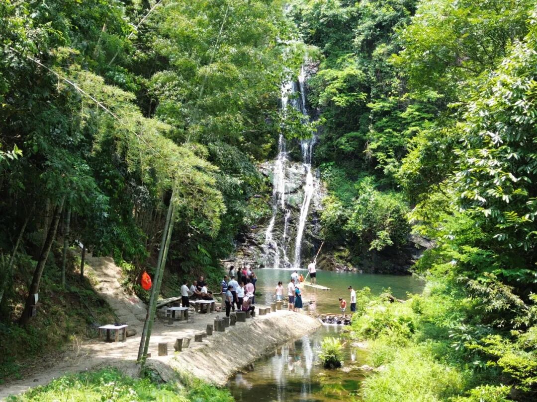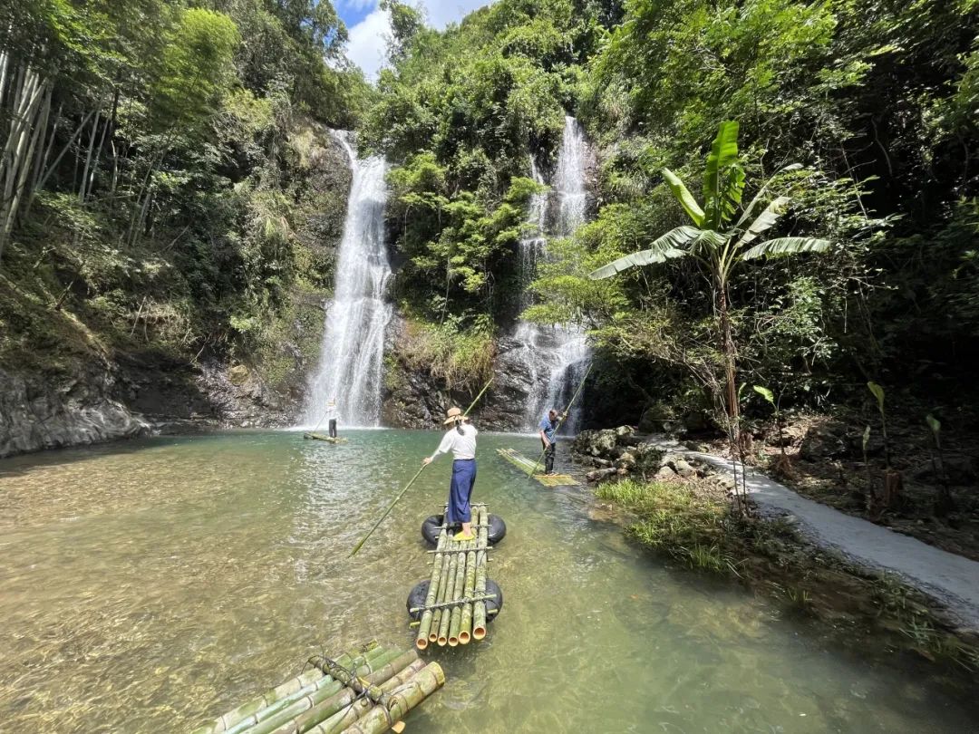 7月18日,在融安县板榄镇蒙村村上滩瀑布,游客正在划竹排。