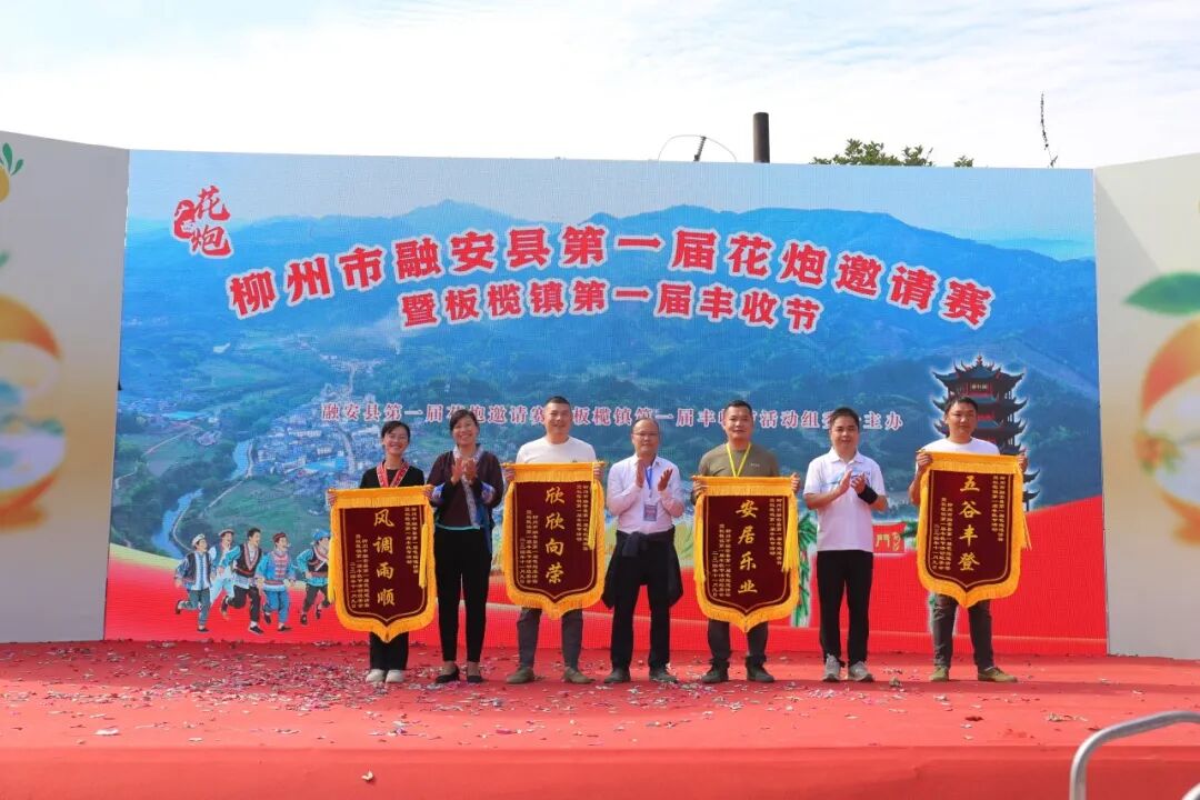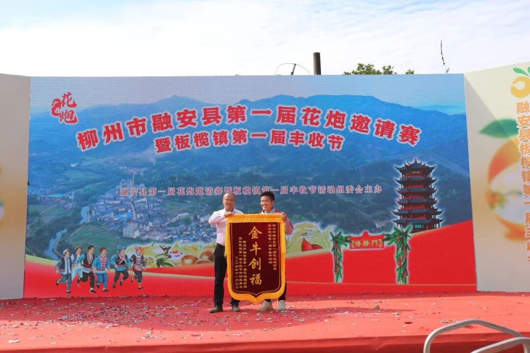 11月9日在融安县板榄镇拍摄的融安县第一届花炮邀请赛暨板榄镇第一届丰收节花炮比赛结束后获胜队伍代表上台领取锦旗。