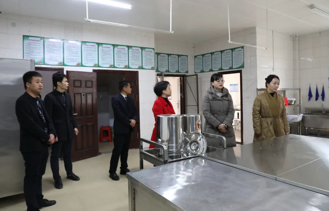 2月22日,县人民政府副县长陶媚(右二)参观融安县长安镇幼儿园食堂。(杨雯静 摄)