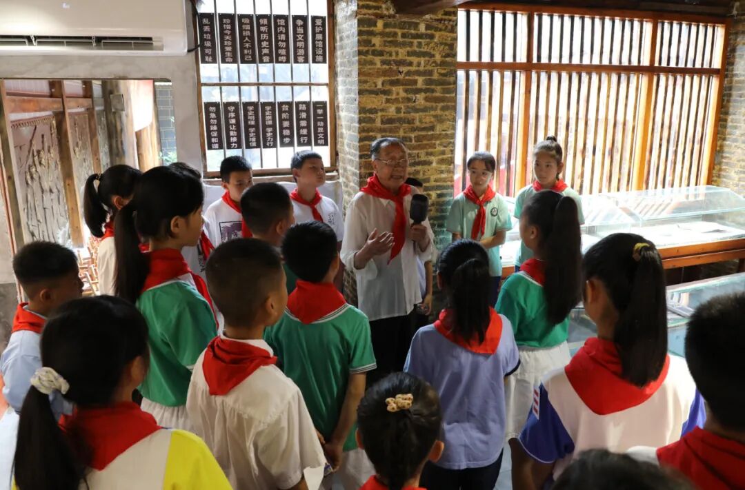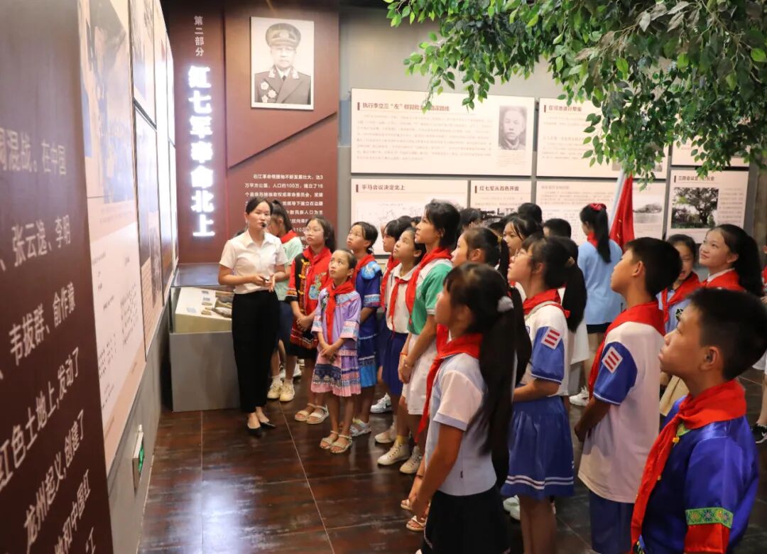 8月2日,在融安县“红七军”战长安纪念馆,少先队员在听讲解员介绍。(杨曼 摄)