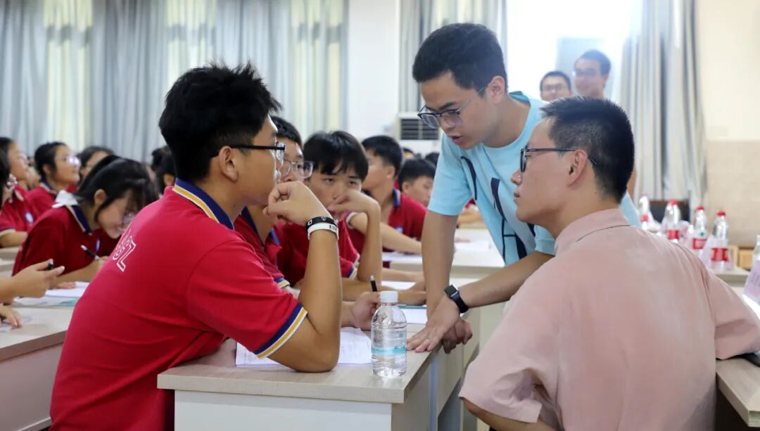 8月15 日,在融安县高级中学励志教育报告会现场,清华大学学生代表与高三同学互动交流。(李思雨 摄)