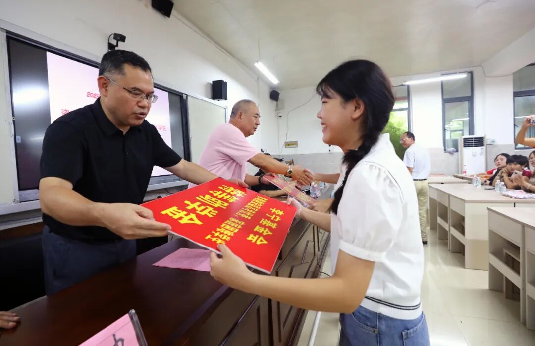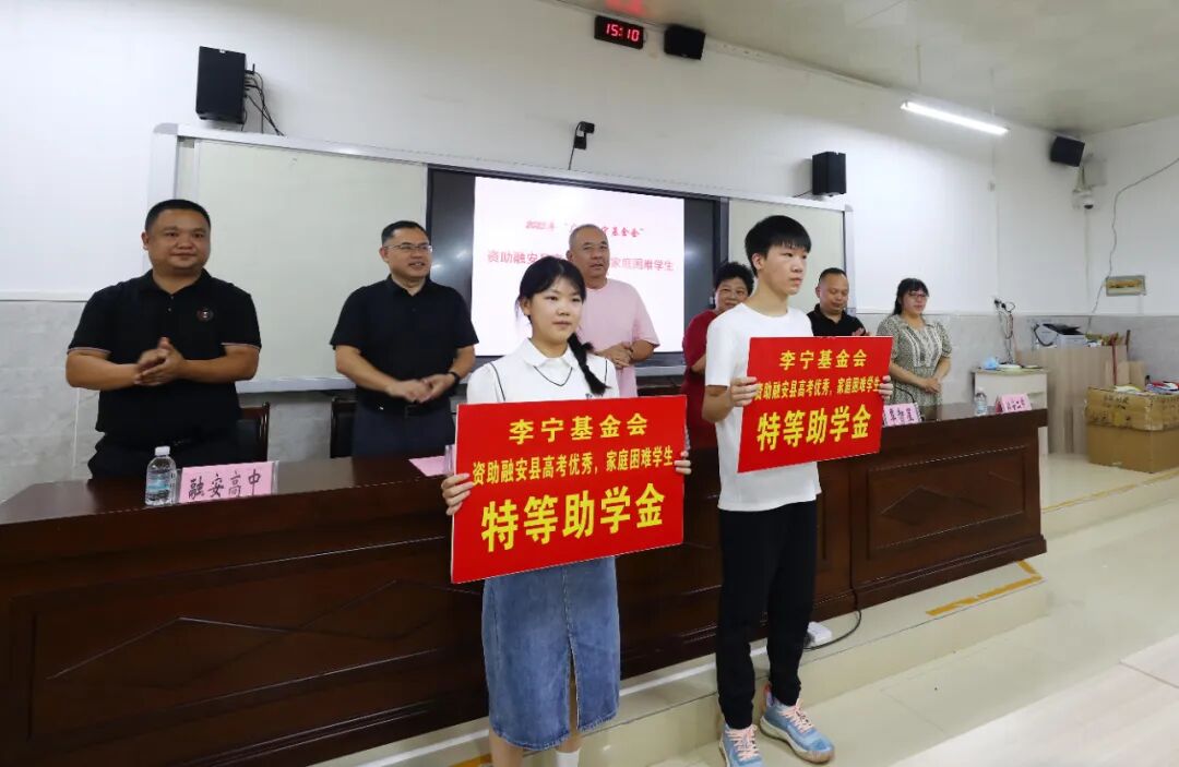 8月22日,在广西柳州市融安县高级中学,县人大常委会副主任朱炳文在为优秀准大学生发助学金。(韦荣军 摄)