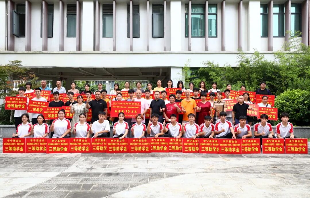 8月22日,在广西柳州市融安县高级中学,大学新生展示领到的助学金并合影留念。(韦荣军 摄)