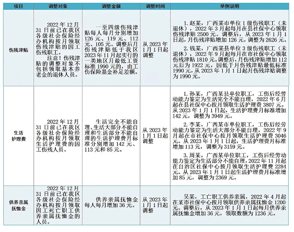 一、2022年12月31日前已在我区各级社会保险经办机构按月领取伤残津贴的因工伤残职工(不包括领取基本养老金的退休人员),一至四级伤残津贴每人每月分别增加126元、119元、112元、105元。调整后月伤残津贴低于我区2023年11月起实行的一类地区月最低工资标准1990元的,由工伤保险基金补足差额。