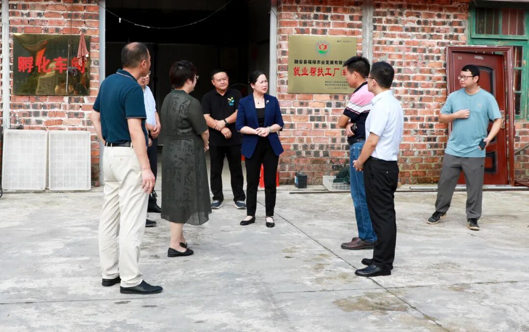 9月7日,自治区残联党组成员、副理事长许英凤(右四)带队到融安县福禄农业发展有限公司大坡飞鸡种苗繁育基地调研。(骆余梦 摄)9月7日,自治区残联党组成员、副理事长许英凤带队到融安县开展残疾人工作调研,加快推进残疾人事业发展补助资金执行进度,促进残疾人就业。