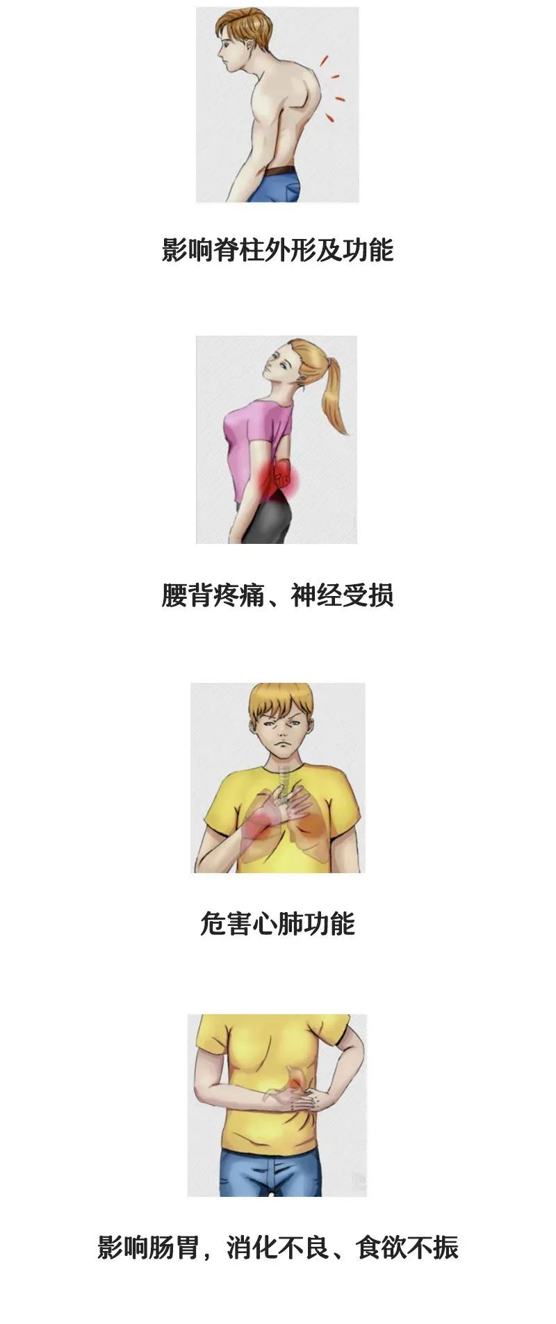 随着脊柱侧弯逐渐加重,外形变化也会显现出来。外形的异常可能导致心理自卑,影响人际交往,久而久之容易出现心理障碍。