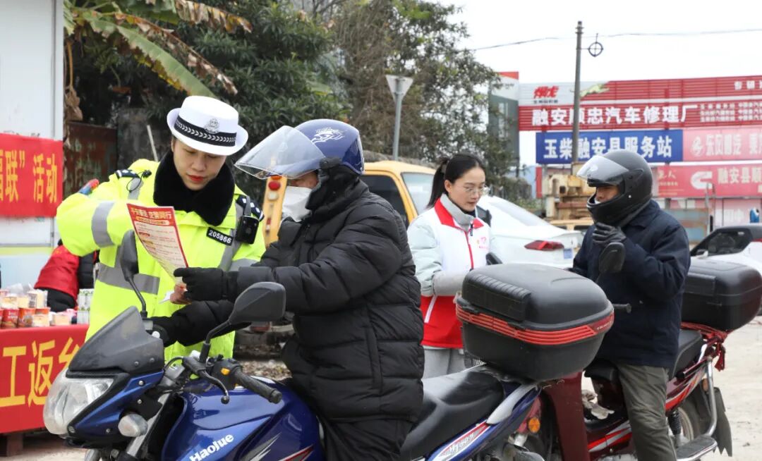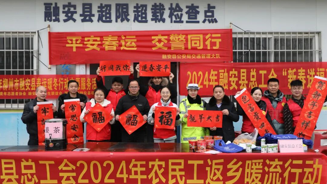 1月26日是2024年春运首日,广西柳州市融安县公安局交通管理大队、交通运输局、总工会、团县委等单位在209国道融安县城段联合开展“平安春运 交警同行”、春运“暖冬行动”等服务活动。