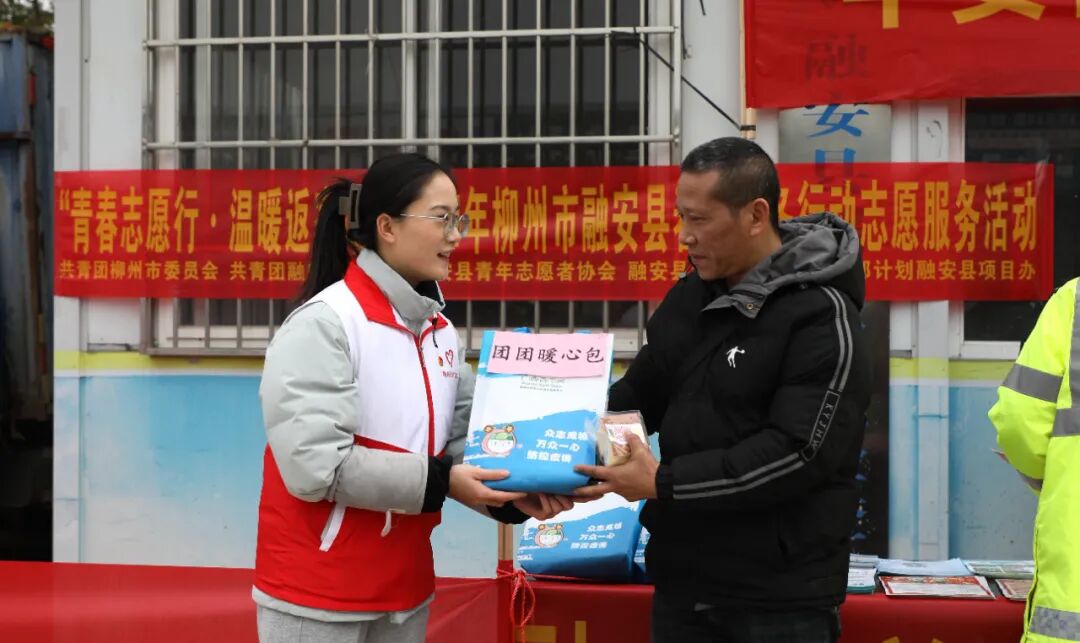 1月26日,在融安县平安大道路段拍摄的春运服务活动现场。(韦骞骞 摄)