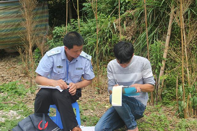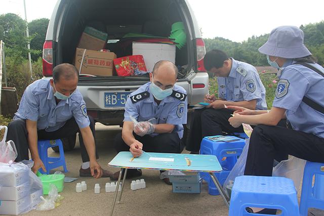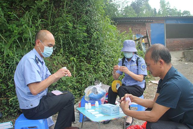 图2:融安县农业农村局动物卫生监督所执法人员在板揽镇里鸟村采样封装生猪尿液