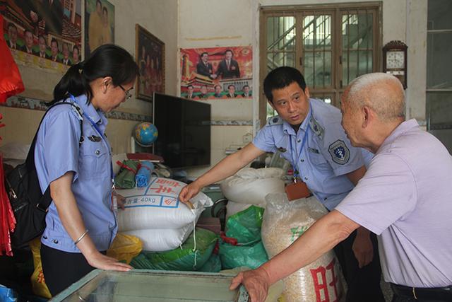 图7:融安县农业农村局动物卫生监督所执法人员在板榄镇集市检查兽药、饲料店在售的饲料