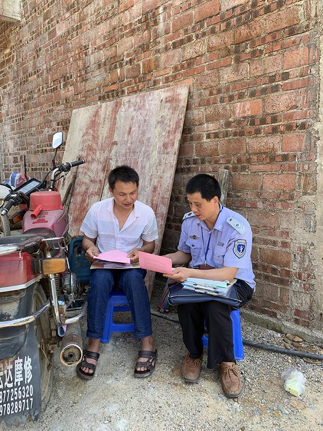 图8:融安县农业农村局动物卫生监督所副所长肖寒强(右一)给养殖户发放、讲解动物疫病防治技术宣传手册