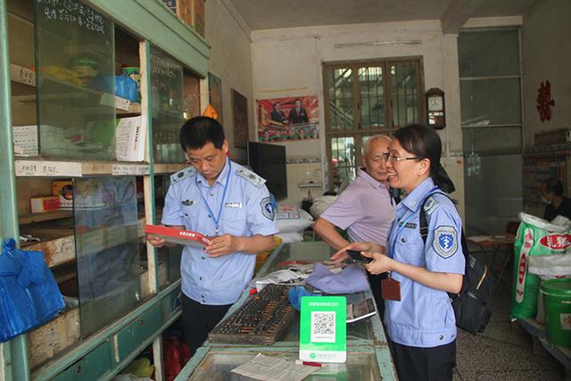 图6:融安县农业农村局动物卫生监督所执法人员在板榄镇集市检查兽药、饲料店在售的兽药