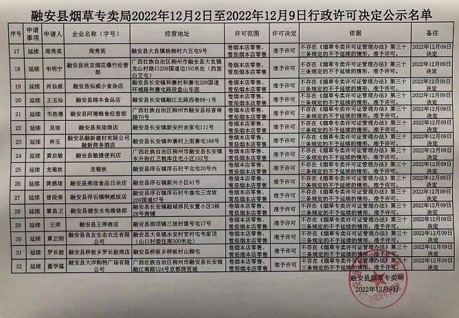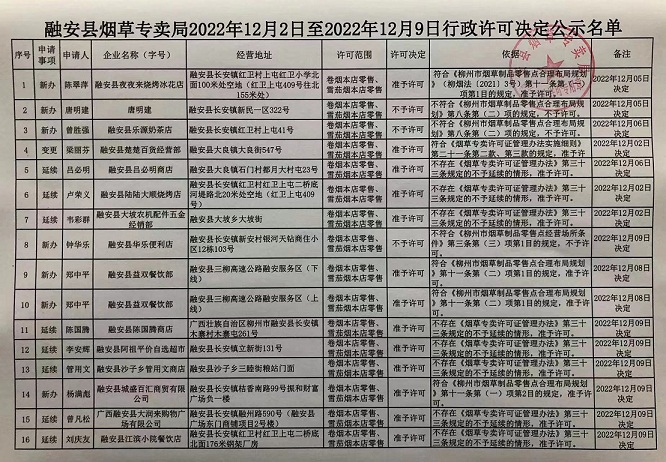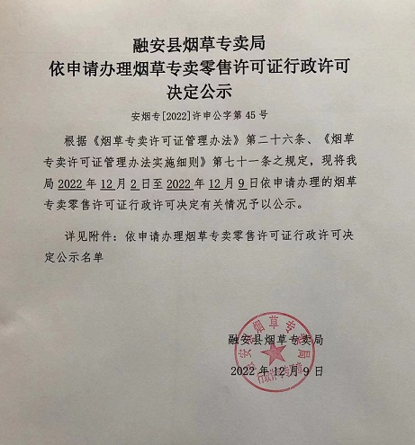 融安县烟草专卖局依申请办理烟草专卖零售许可证行政许可决定公示(安烟专[ 2022 ] 许申公字第45号)