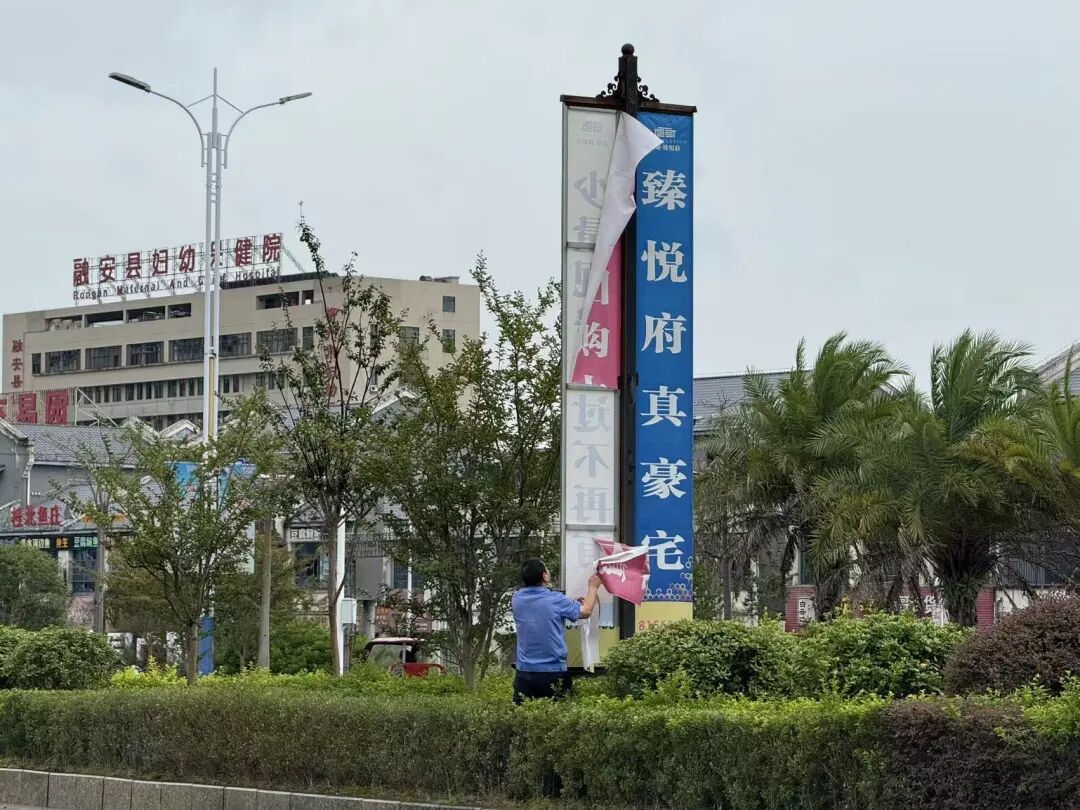 9月25日,执法人员正在处置存在安全隐患的广告牌