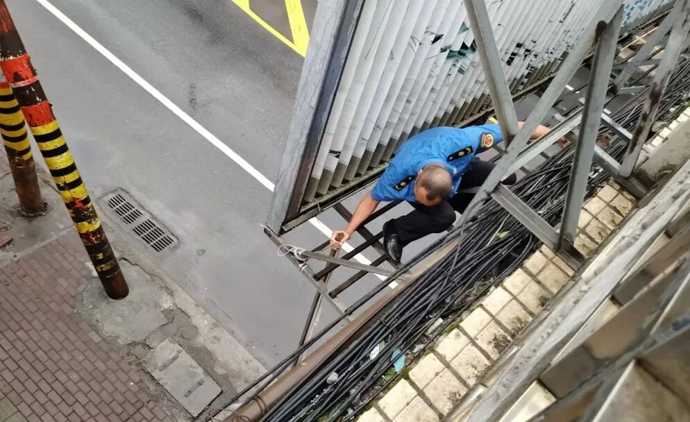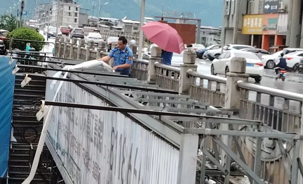 执法人员首先在危险路段两侧有序疏散市民群众、引导车辆绕行,同时耐心向过往市民说明险情情况,温馨提示市民安全通行路线,确保现场秩序平稳。然后执法人员迅速行动,高效拆除清理破损广告布,及时搬离破损严重、不够稳固的广告牌,并对松动的公共设施采取修复、加固等措施,切实履行安全监管责任。经第一时间紧急处置,脱落及破损的广告牌已全部拆除,大桥上松动的铁架栏杆也得到妥善处理,有效保障了市民的出行安全。