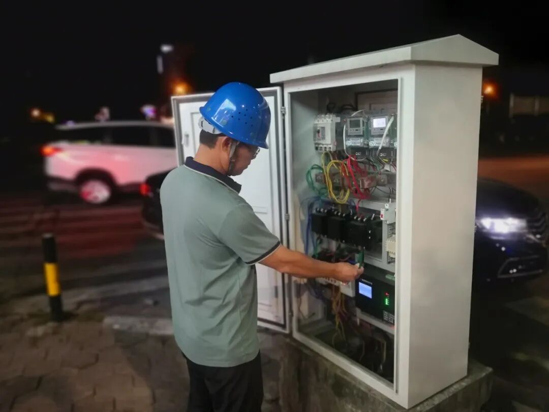 节日期间,路灯站工作人员正在对城区路灯控制箱进行安全检查