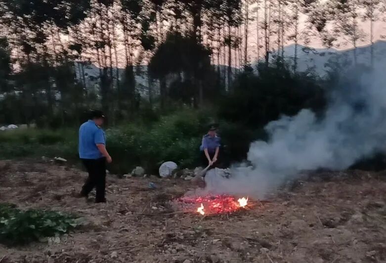 执法人员正在处置秸秆垃圾露天焚烧行为