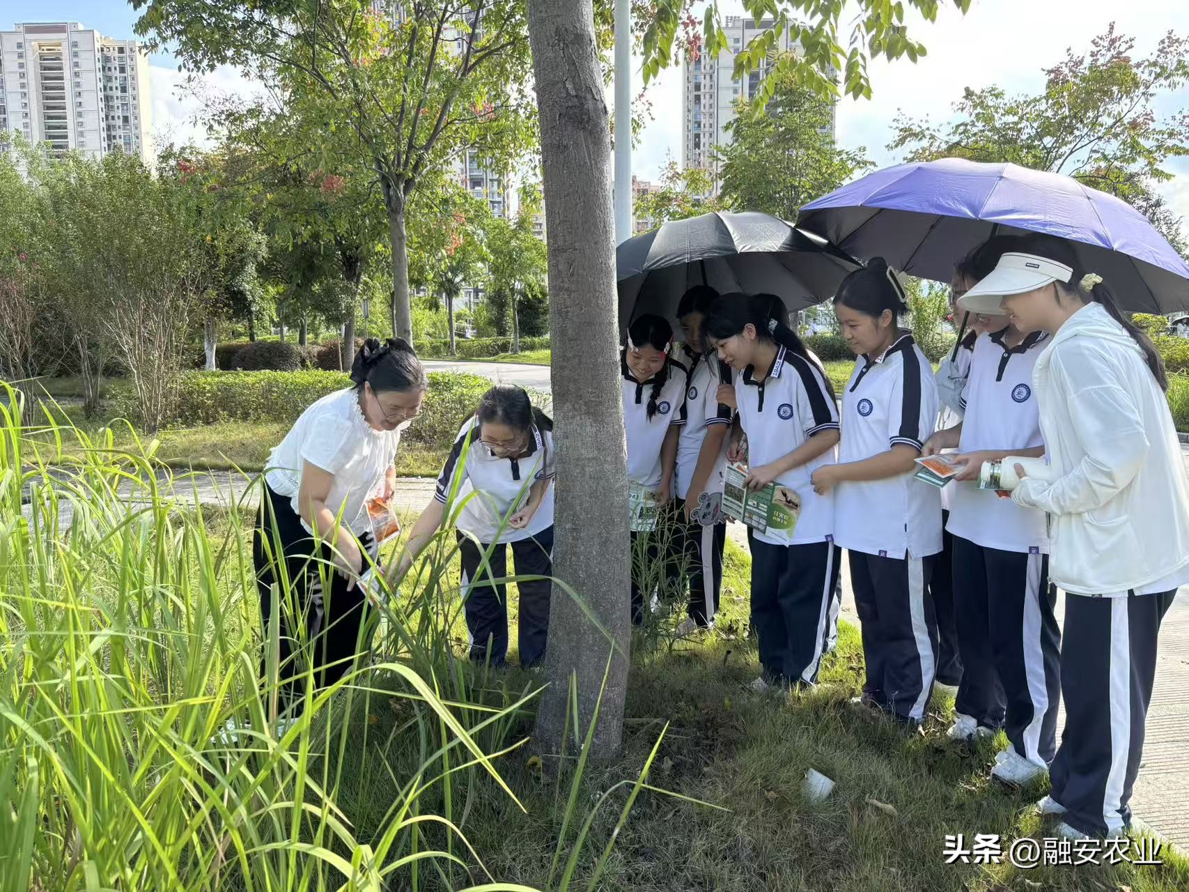 技术人员带领学生到校园内草坪观察红火蚁蚁巢特征,并现场演示红火蚁防控技术