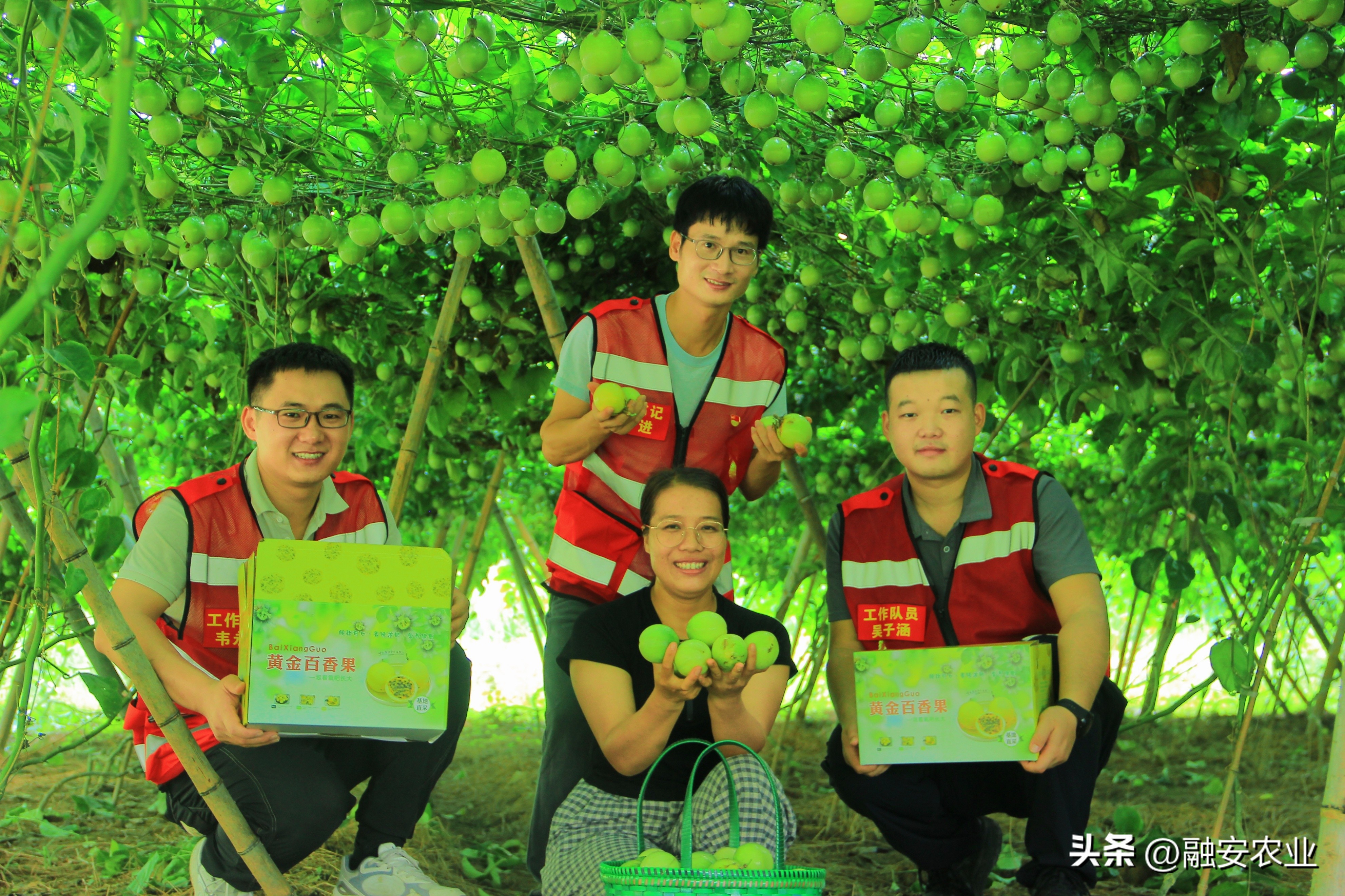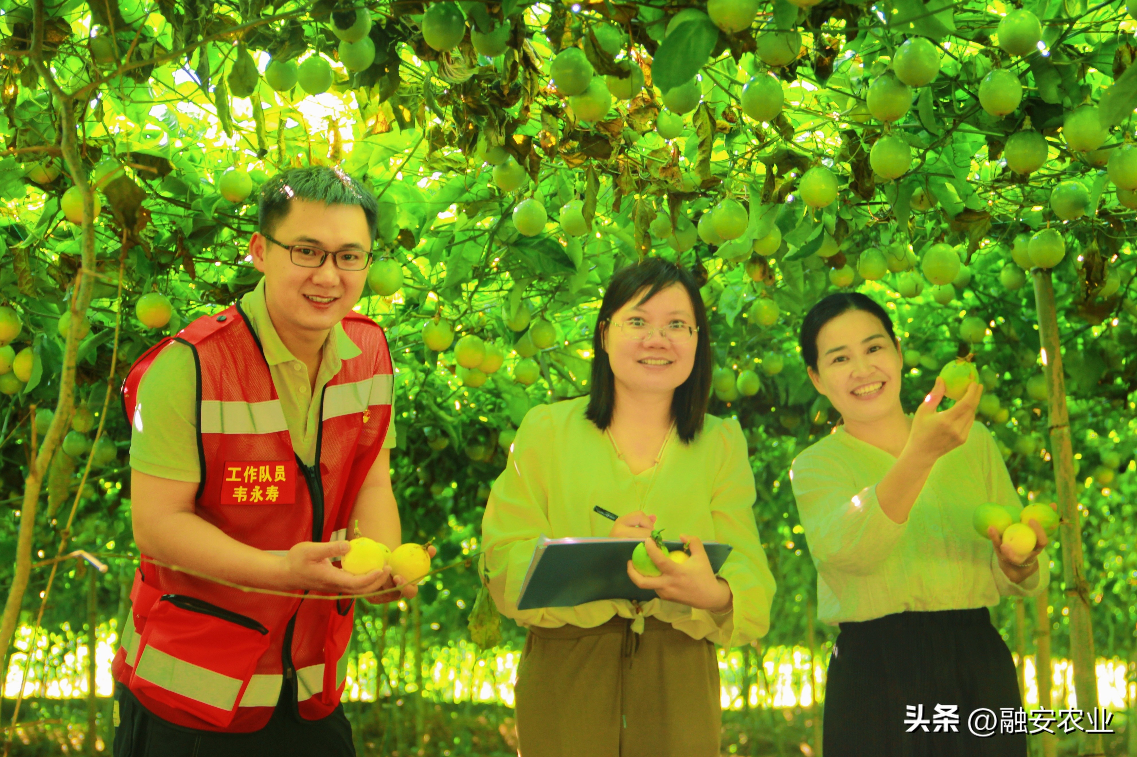 融安县东起乡崖脚村驻村工作队员和种植户在展示成熟采摘的黄金百香果
