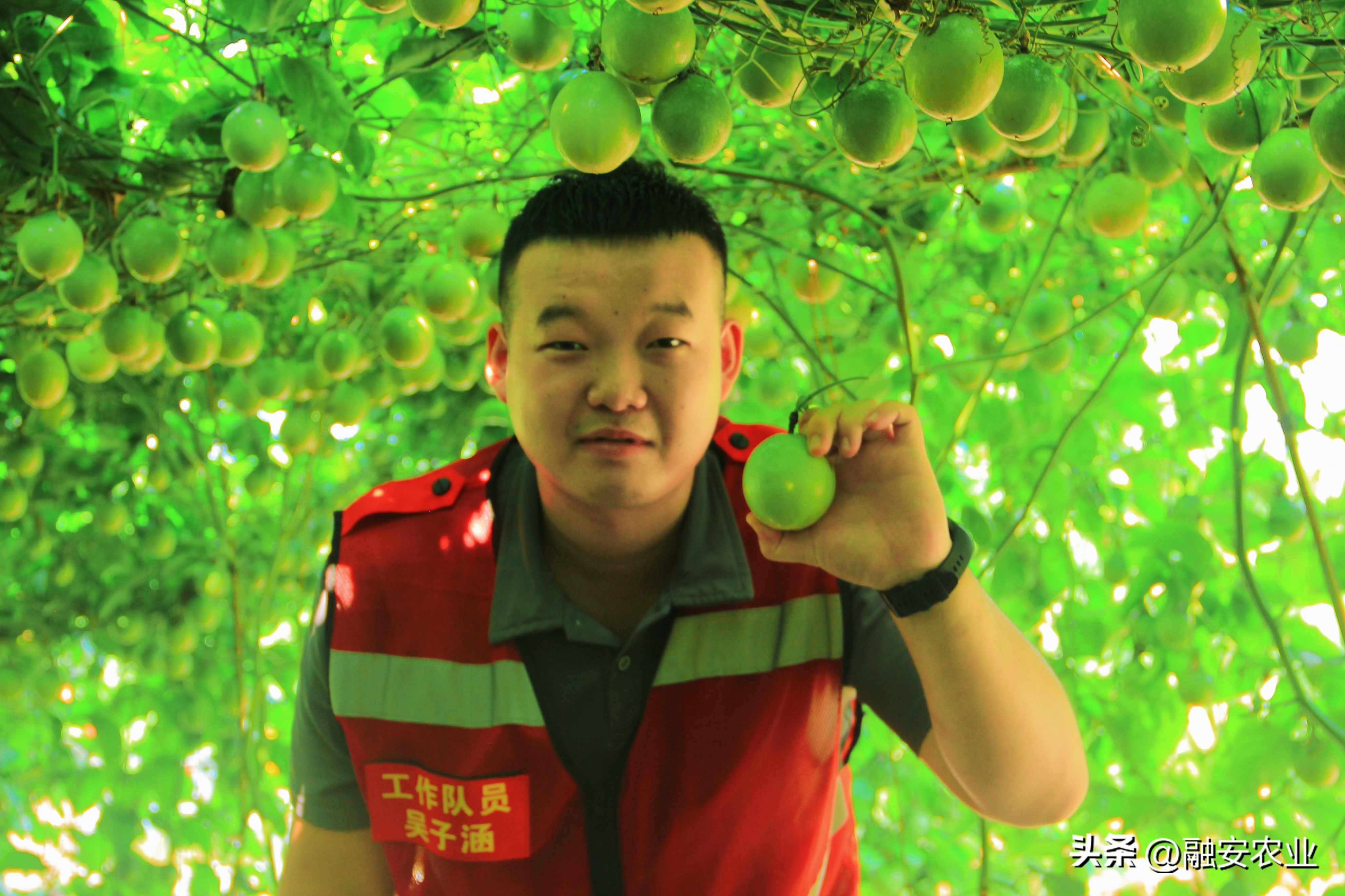 融安县东起乡崖脚村驻村工作队员在展示成熟采摘的黄金百香果