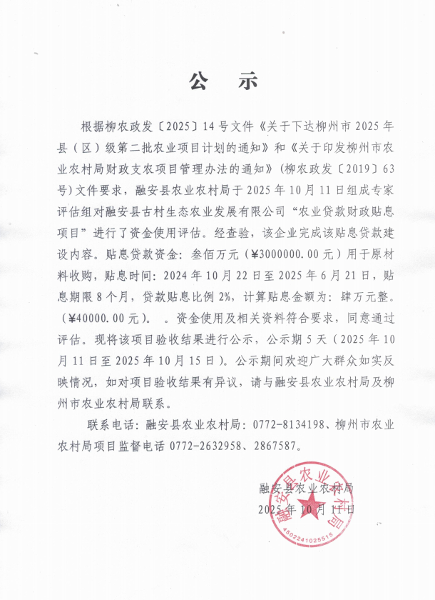 融安县古村生态农业发展有限公司“农业贷款财政贴息项目”验收结果公示