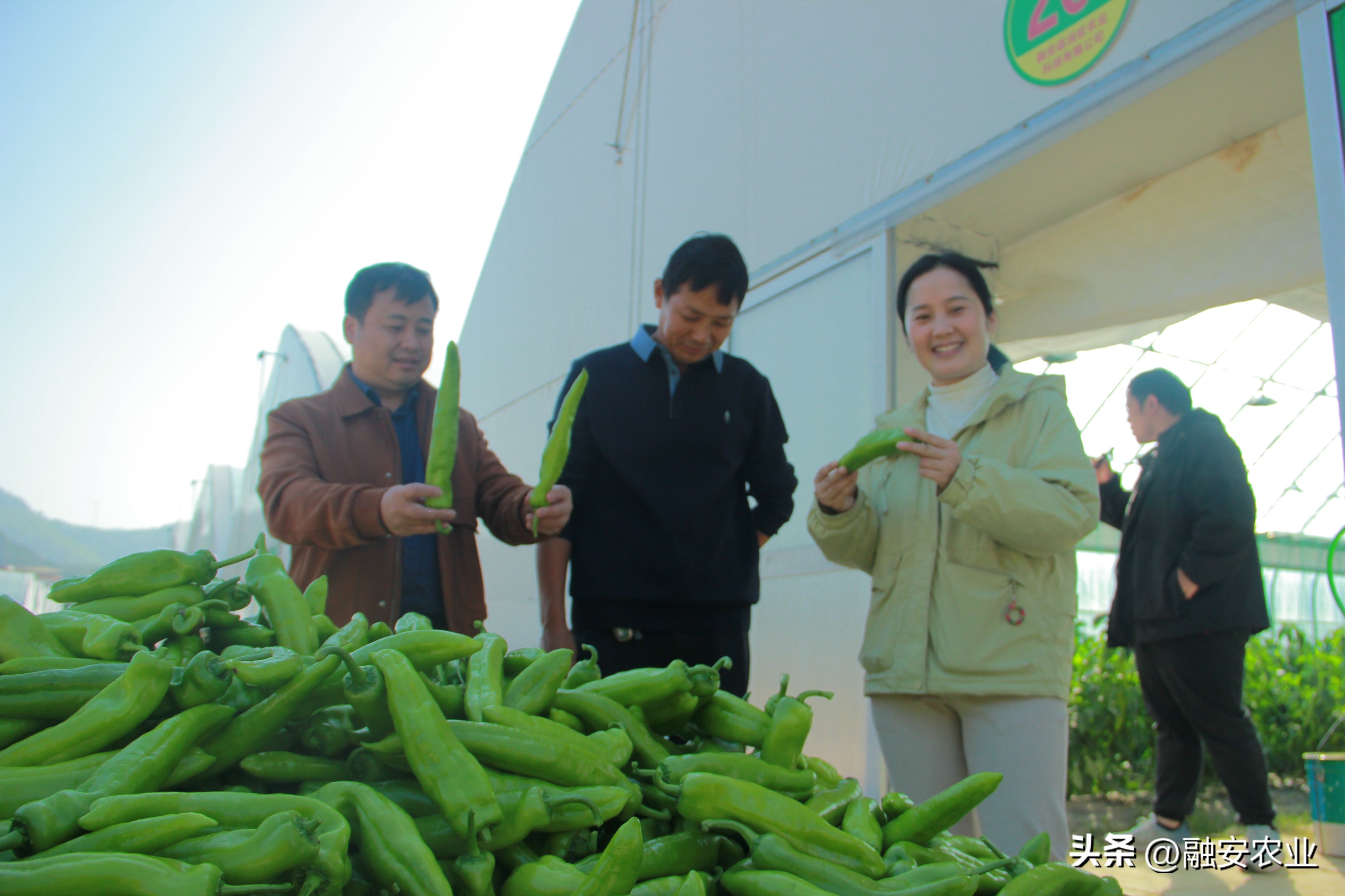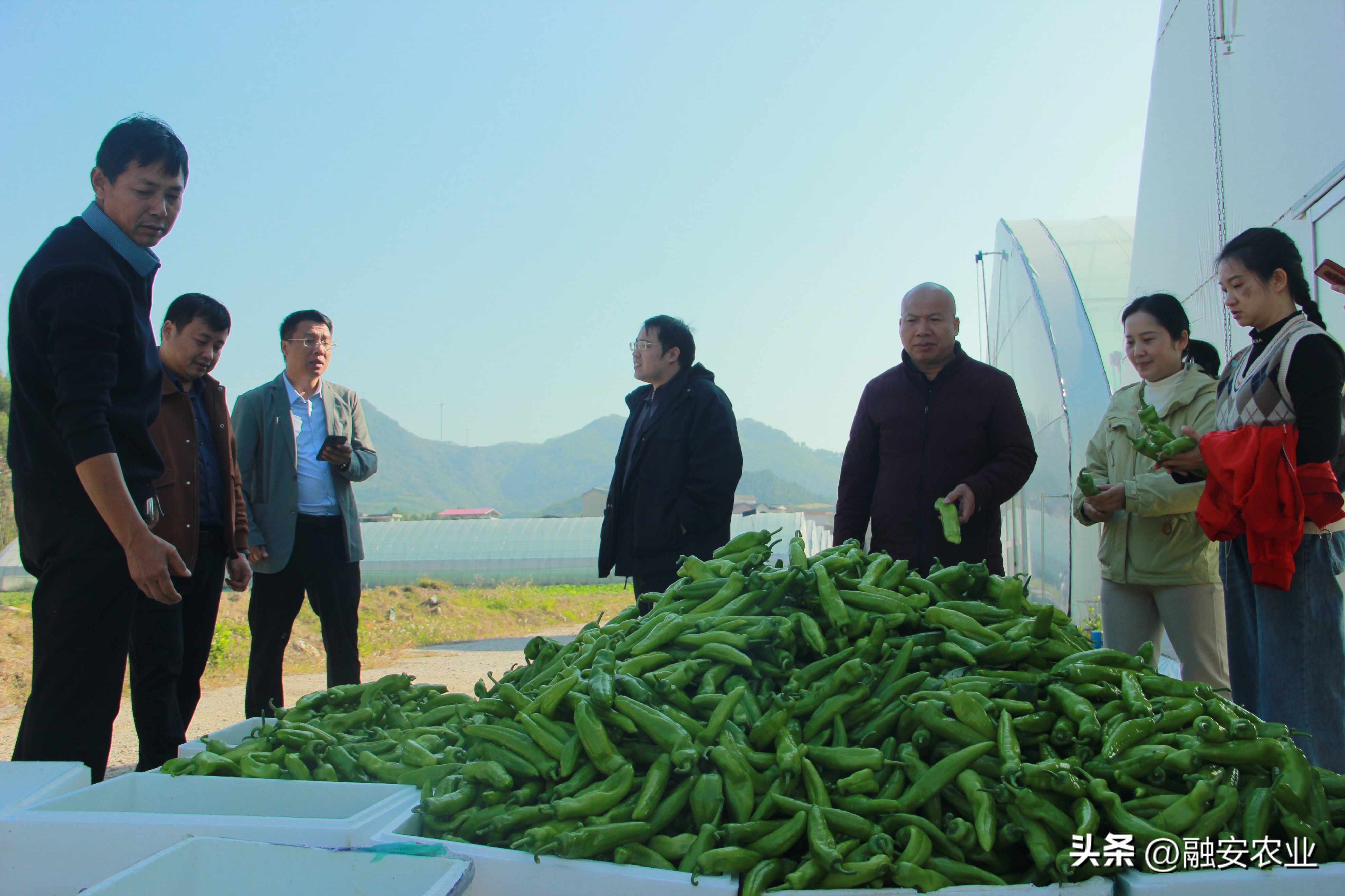 融安县农业农村局副局长韦健谋与农业技术员、基地负责人查看刚采收的辣椒