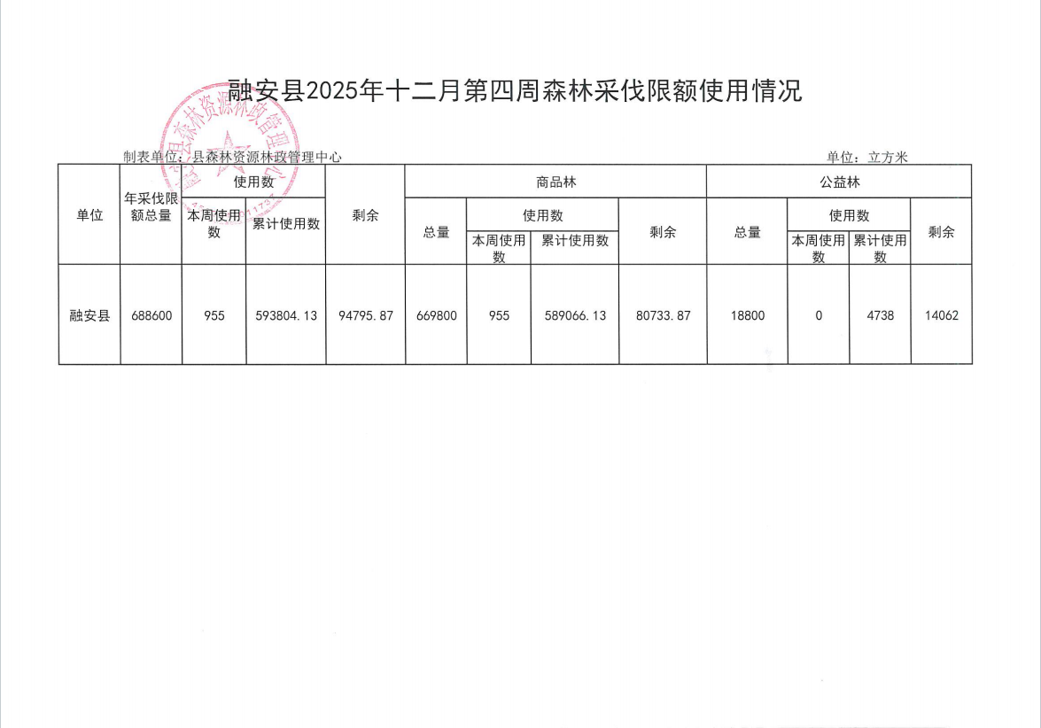 融安县2025年十二月第四周森林采伐限额使用情况