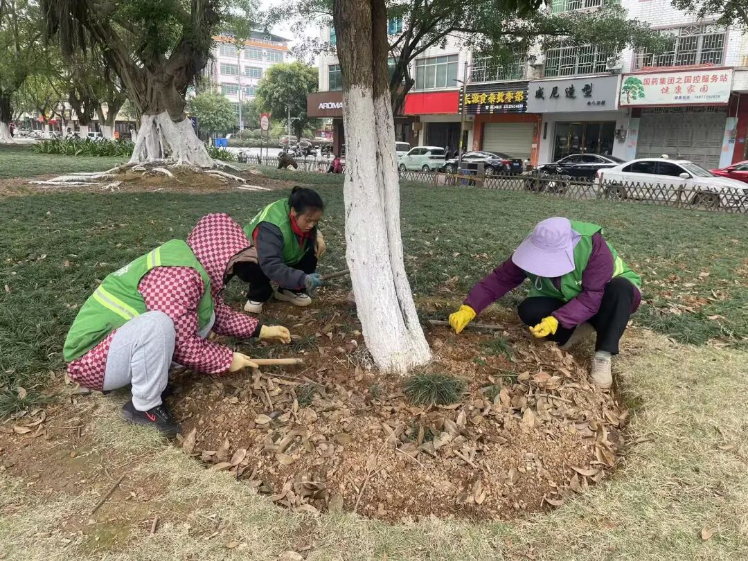 整理公园广场树盘,深耕细作养根基