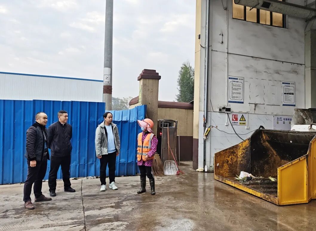 检查组一行首先来到融安县红卫中转站,围绕压缩设备运行状况、电气线路安全、消防设施配备及站内环境卫生情况进行逐项检查。覃利明详细询问了日常垃圾处理量、设备检修频率和作业人员安全培训情况,要求中转站负责人严格落实安全生产主体责任,加强设备日常维护保养,确保垃圾中转作业安全高效运行。