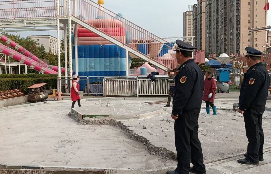 1月10日,执法人员正在检查长安广场游乐设施场所经营业主拆除违建水泥地面的情况