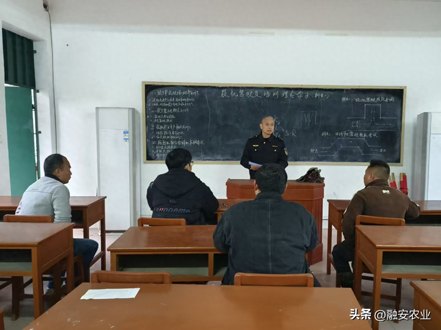 融安县农业农村局农机校以及农机执法中队工作人员和培训学员在就考试注意事项进行交流